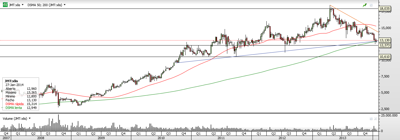 Quanto à JMT está numa tendência descendente e como tal eu não invisto nela. Na minha opinião gosto da empresa mas isso não se está a reflectir neste momento, quem sabe se é por causa da concorrência na Polónia (redução das margens) ou se o negócio na Colômbia está com algumas dificuldades, etc... a verdade é que actualmente a JMT não está interessante.