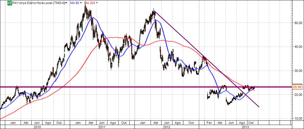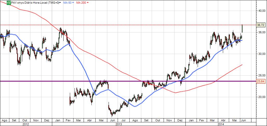 Sem quebras de suporte, movimentos de subida bruscos com consolidação durante 2 meses têm caracterizado o título no último ano.