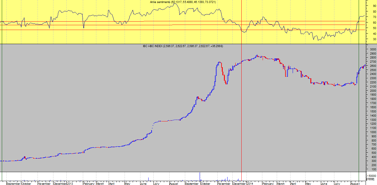 As regras são muito simples: há 3 linhas de referência de sentimento. Acima da mais alta o sentimento do mercado é muito positivo, abaixo da mais baixa o sentimento é muito negativo e a linha do meio será a do equilíbrio geral mas para efeitos de position trading já não terá grande importância uma vez que representa um balanço emocional neutral à escala temporal utilizada. Embora eu reconheça que a linha intermédia possa ser muito interessante para efeitos de swing trading, quando utilizada em posições contrárias para períodos mais curtos, era sessa a intenção do Arnie, embora não conheça as regras de entrada e saída que ele usava na altura com esse período, e daí que era ótimo que ele pudesse confirmar se é que ainda se lembra desses bons velhos tempos de pesquisa de bons indicadores.