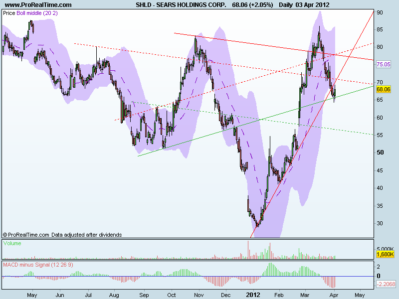 Alguem acompanha a Sears? Fica o gráfico actualizado. A minha expectativa é que inverta a tendencia descendente que iniciou a meio do mês de março. O facto do preço se encontrar na base inferior das BB levou-me a entrar longo. Se as minhas expectativas sairem furadas, tenho o meu stop ligeiramente abaixo MM200