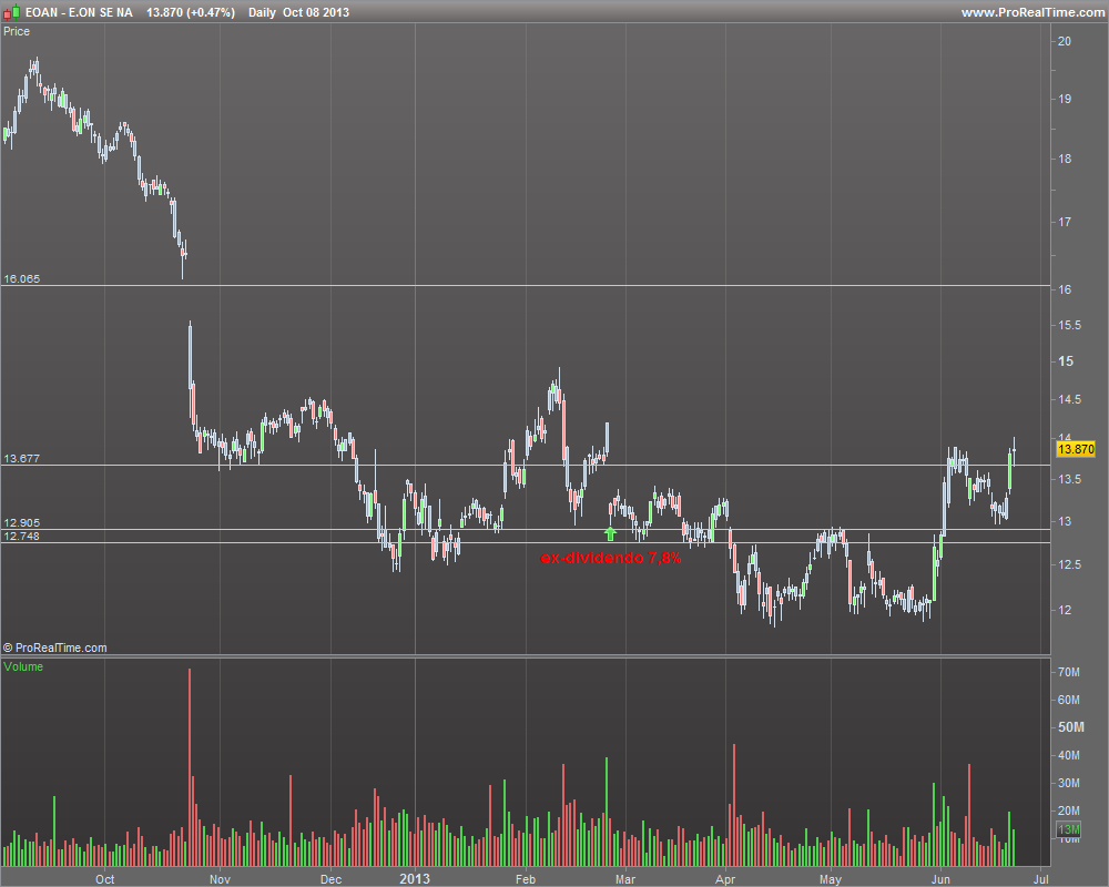 Essa sessão também me chamou a atenção, apesar de ser um título que já venho a acompanhar há algum tempo. Note-se que a valores corrigidos do dividendo (brutal) que distribuíram em Maio, a sessão teria fechado mesmo em cima da resistência dos ~13,7 e os últimos dois meses teriam sido passados acima do suporte nos ~12,7. Julgo que um gráfico corrigido neste título em particular daria a impressão de se estar a desenhar um fundo com um ano - mas a minha opinião em relação a gráficos corrigidos é suspeita - ainda assim no PRT continua por corrigir... acho que tenho mesmo que lhes mandar um e-mail.