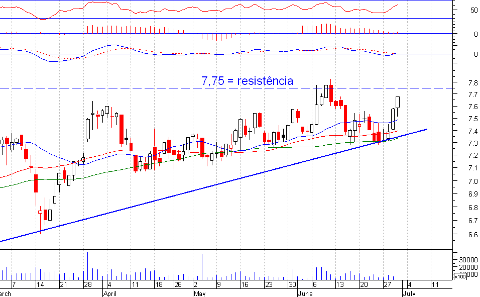 Os ímpetos compradores foram travados pela já conhecida resistência dos 7,75.