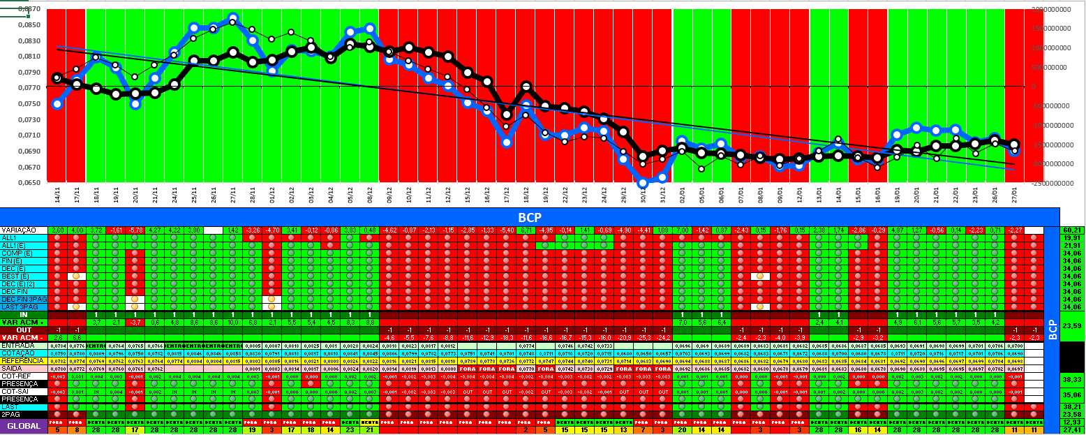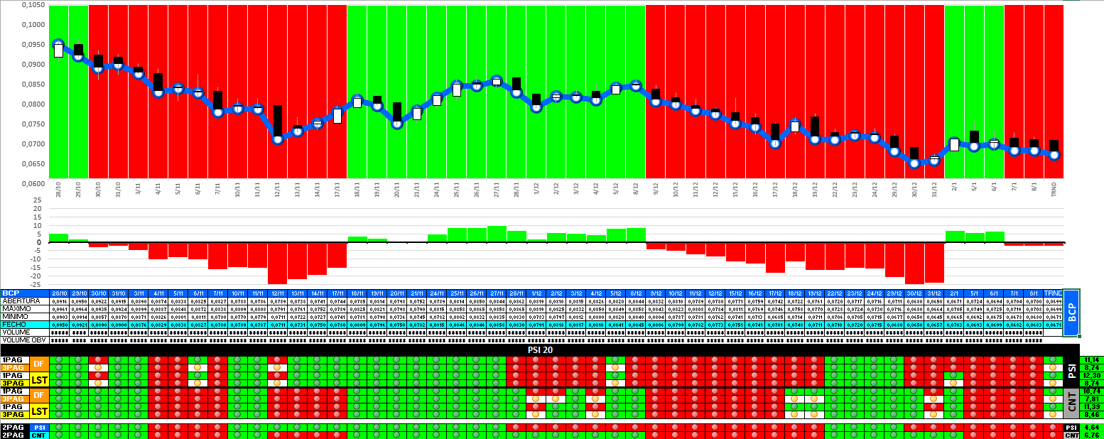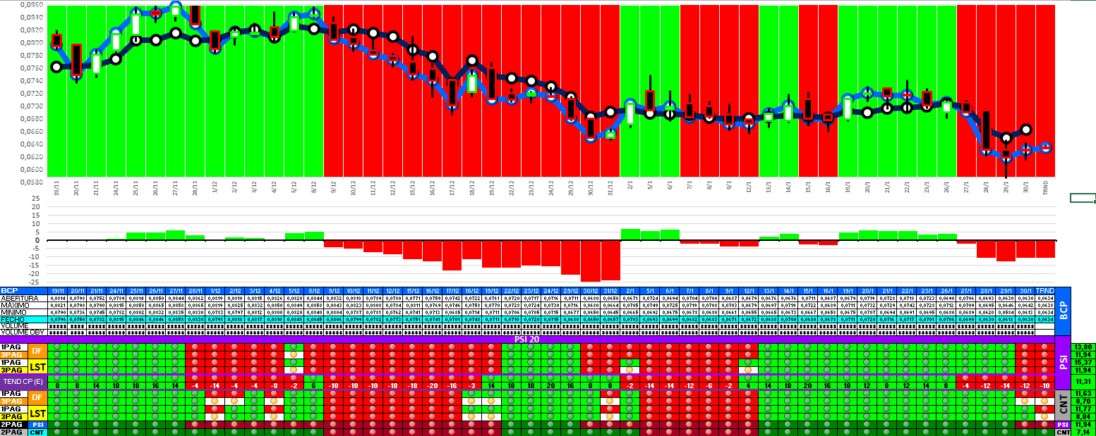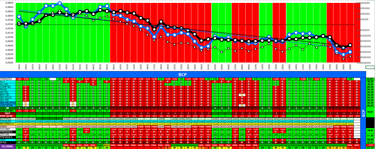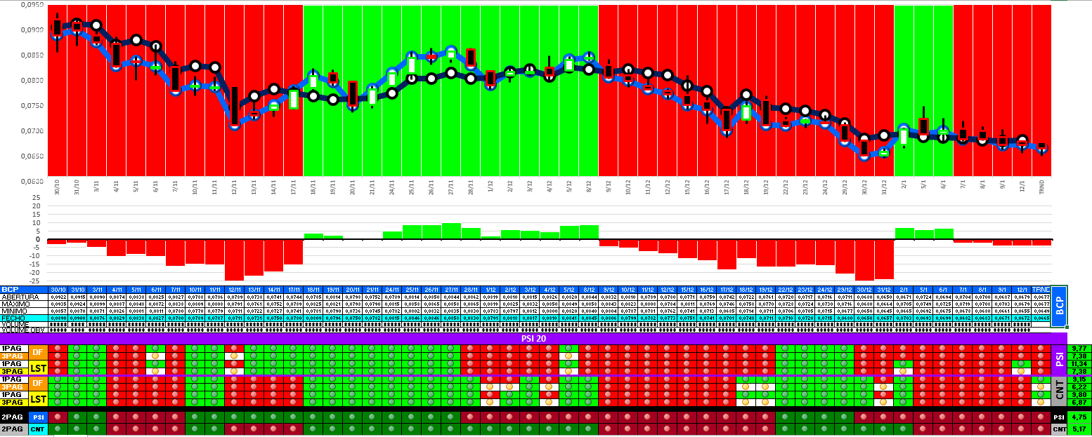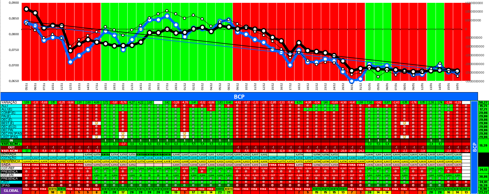 O modelo continua a dar sinal negativo para o BCP, mas nota-se uma indecisão latente. Diria que tudo depende da evolução de amanhã. Importa estar atento ao comportamento da banca (BPI e BANIF). Se o movimento positivo iniciado hoje pela globalidade dos títulos do PSI 20 tiver continuidade amanhã, então diria que estamos perante um sinal claro de entrada. Se pelo contrário, hoje foi só um fogacho, então o melhor é não entrar e continuar de fora a aguardar por melhores ventos e marés. Estamos no inverno e está muito frio para fazer windsurf
