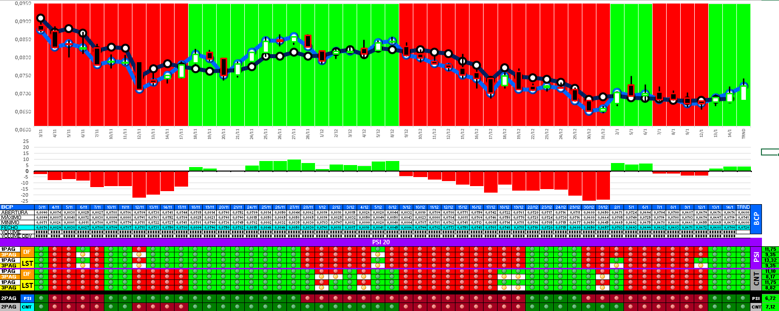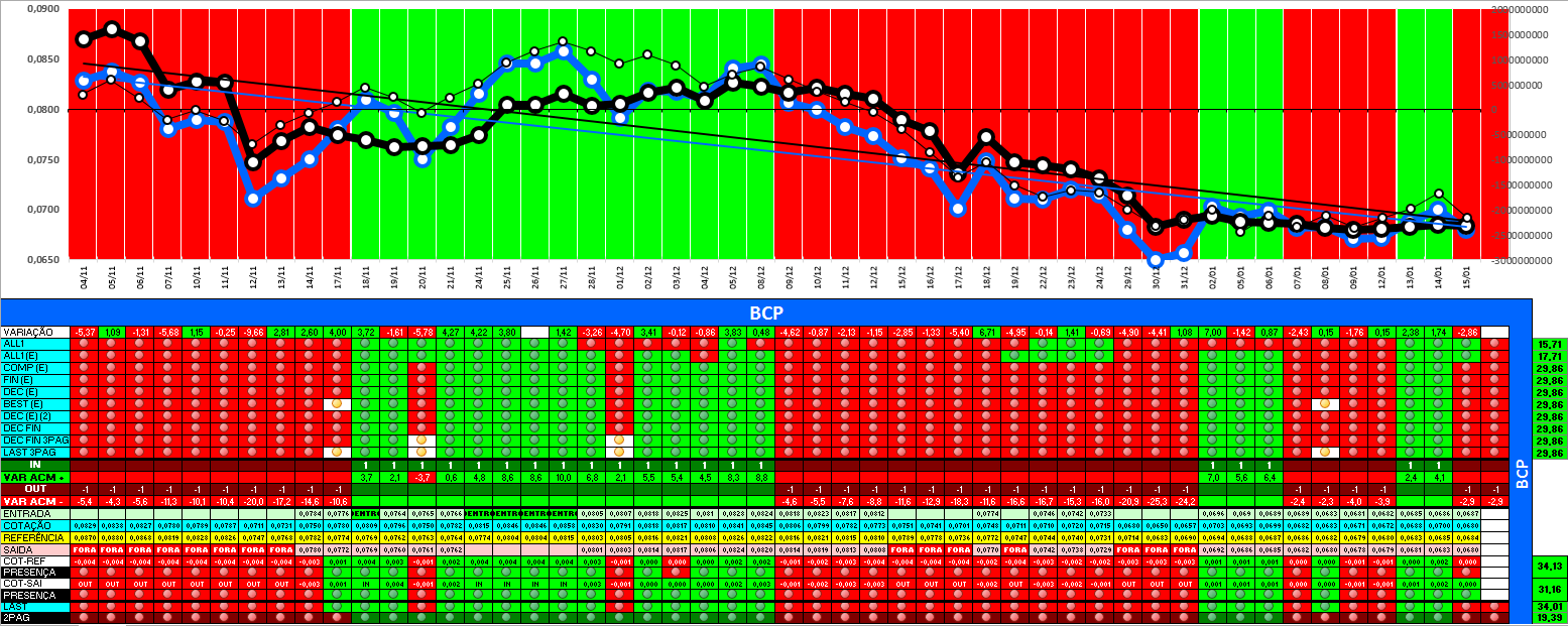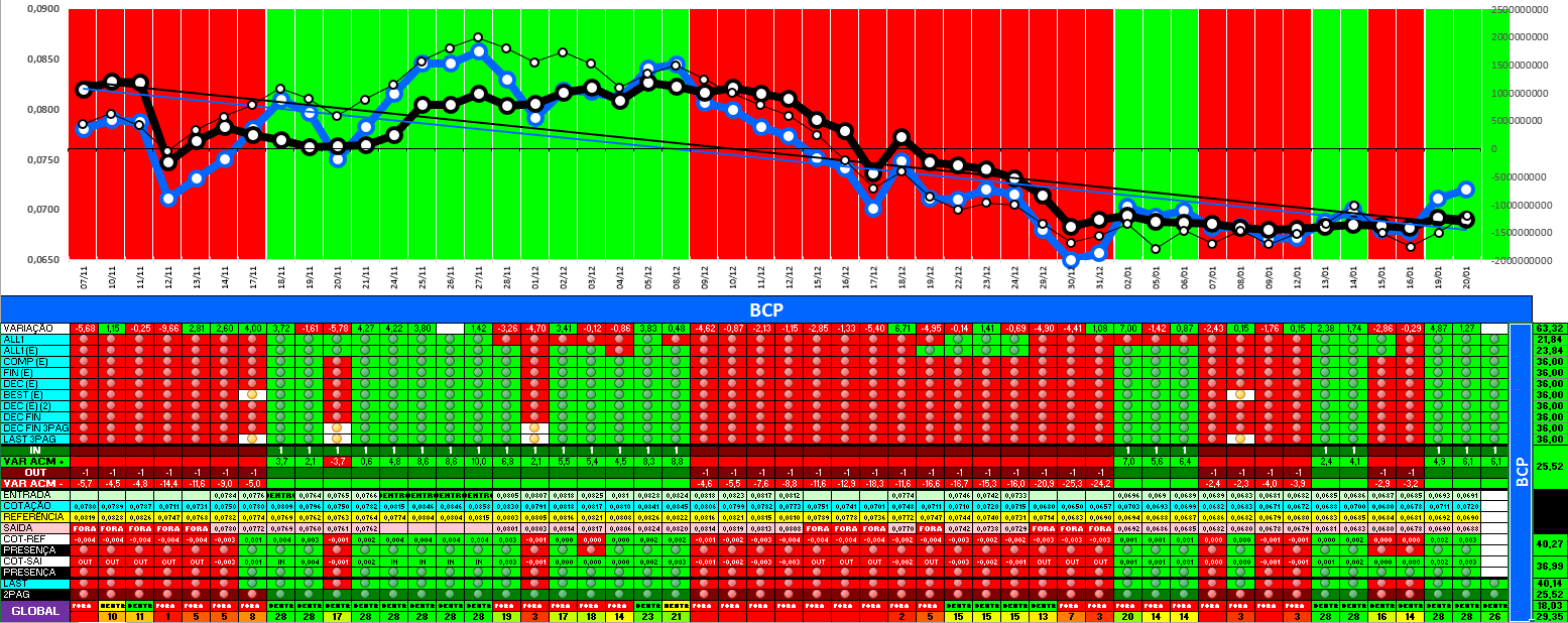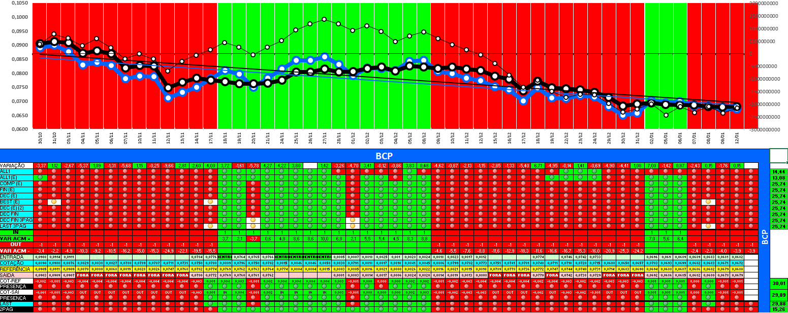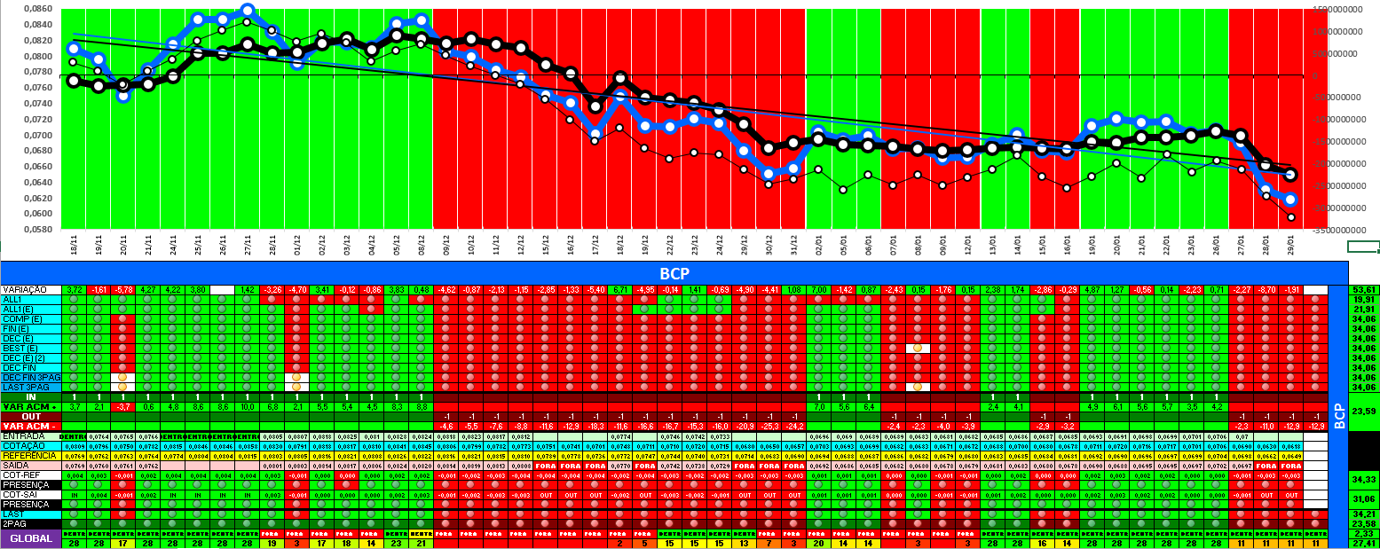 O modelo continua a dar sinal negativo para o BCP, mas nota-se uma indecisão latente. Diria que tudo depende da evolução de amanhã. Importa estar atento ao comportamento da banca (BPI e BANIF). Se o movimento positivo iniciado hoje pela globalidade dos títulos do PSI 20 tiver continuidade amanhã, então diria que estamos perante um sinal claro de entrada. Se pelo contrário, hoje foi só um fogacho, então o melhor é não entrar e continuar de fora a aguardar por melhores ventos e marés. Estamos no inverno e está muito frio para fazer windsurf