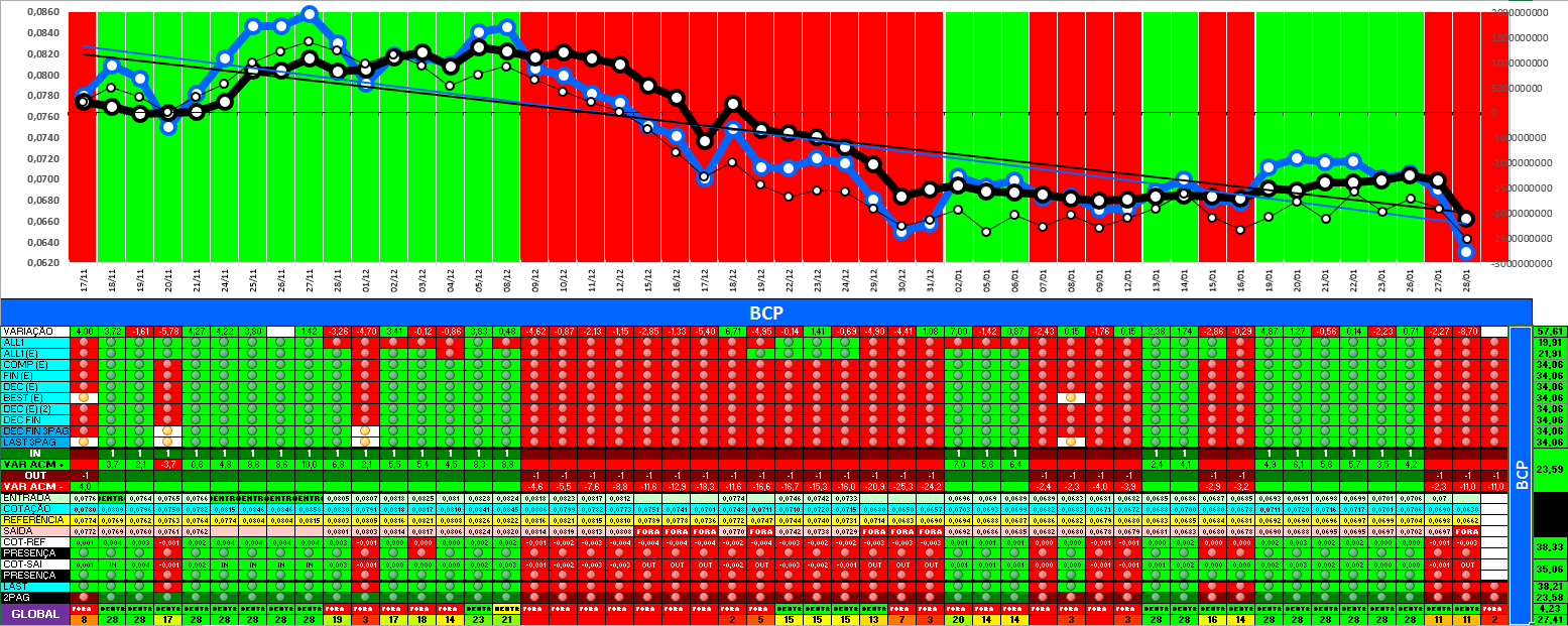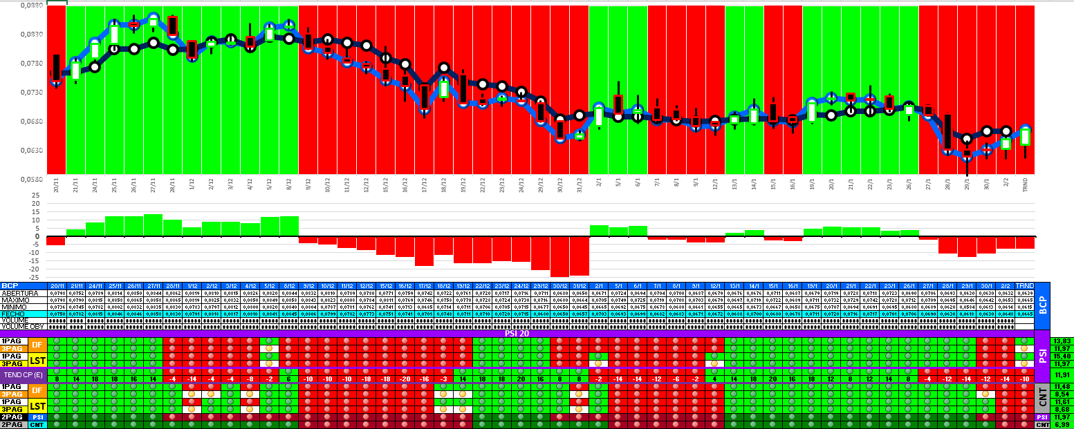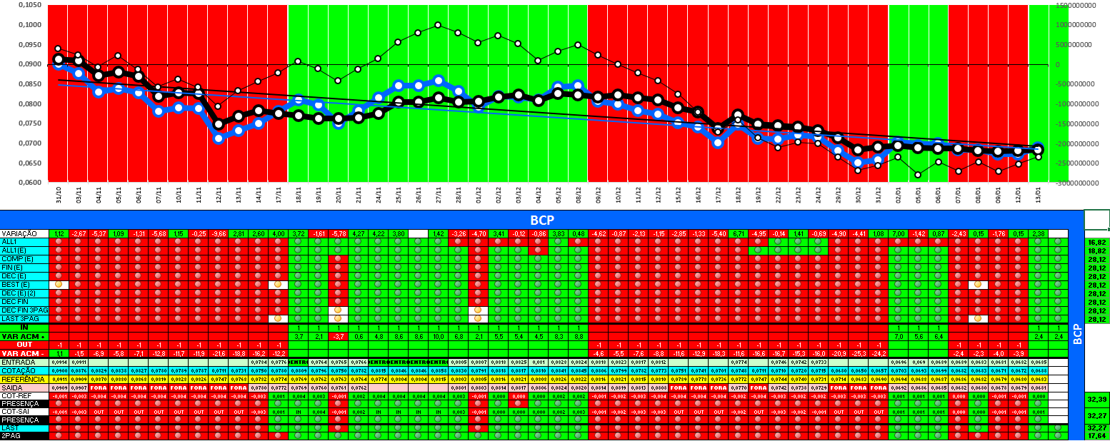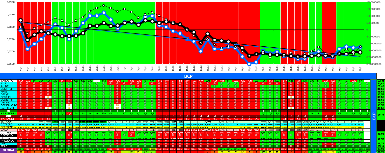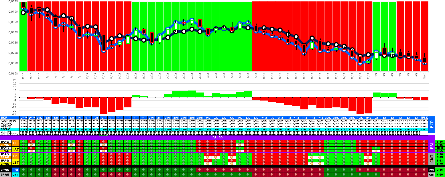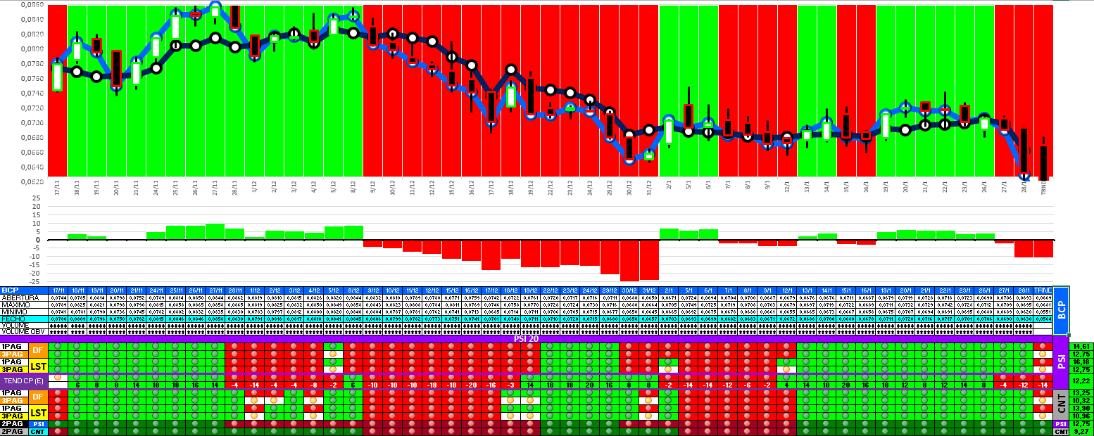 O modelo continua a dar sinal negativo para o BCP, mas nota-se uma indecisão latente. Diria que tudo depende da evolução de amanhã. Importa estar atento ao comportamento da banca (BPI e BANIF). Se o movimento positivo iniciado hoje pela globalidade dos títulos do PSI 20 tiver continuidade amanhã, então diria que estamos perante um sinal claro de entrada. Se pelo contrário, hoje foi só um fogacho, então o melhor é não entrar e continuar de fora a aguardar por melhores ventos e marés. Estamos no inverno e está muito frio para fazer windsurf