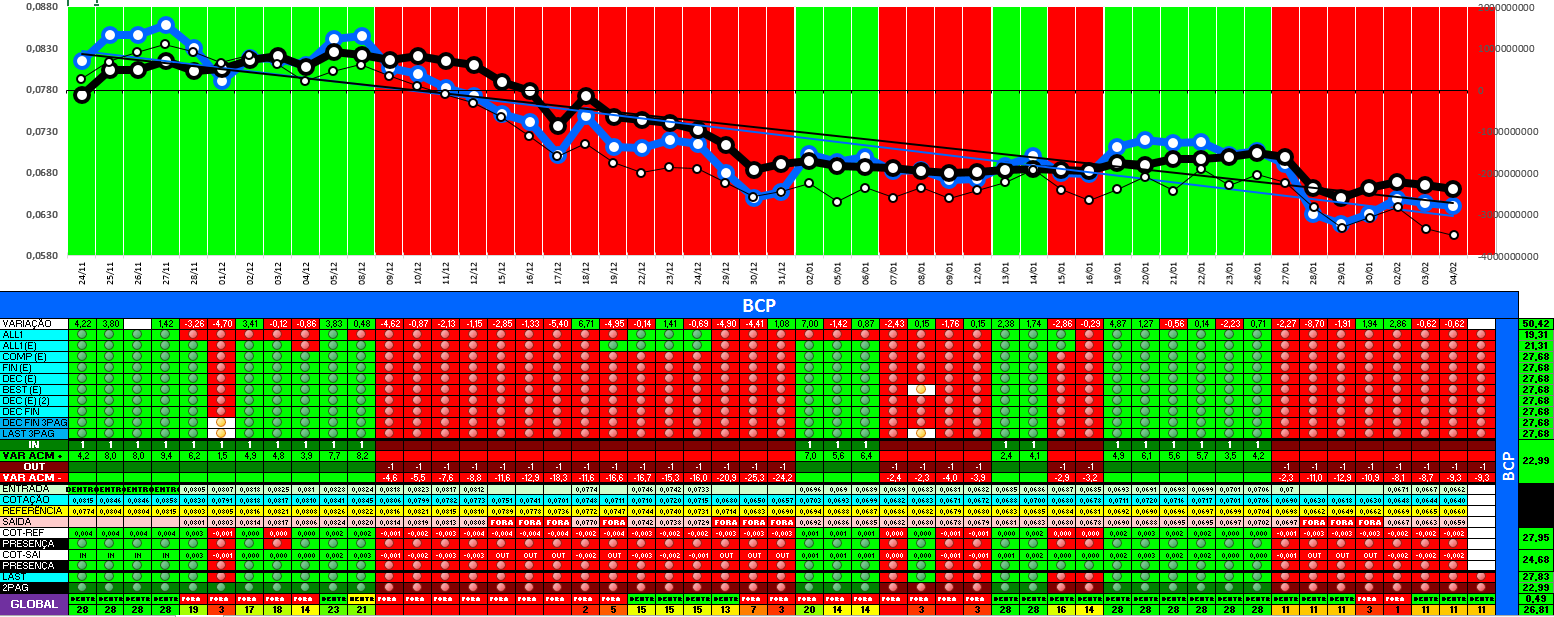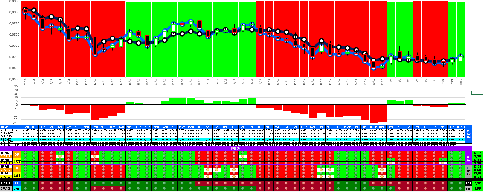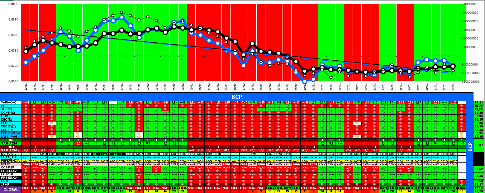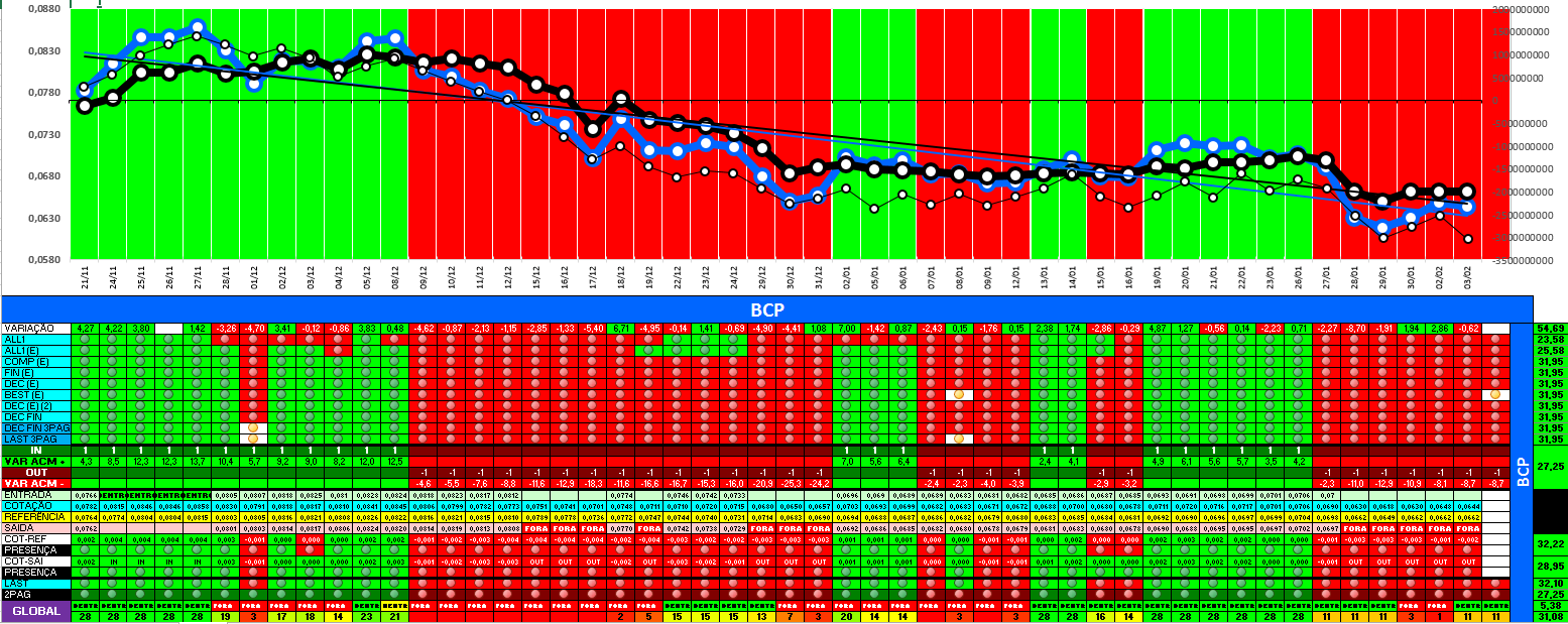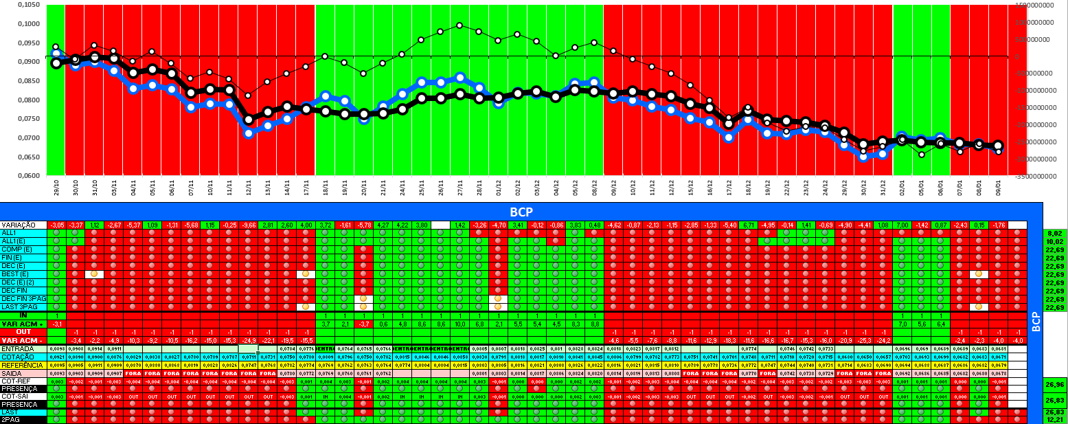 O modelo continua a dar sinal negativo para o BCP, mas nota-se uma indecisão latente. Diria que tudo depende da evolução de amanhã. Importa estar atento ao comportamento da banca (BPI e BANIF). Se o movimento positivo iniciado hoje pela globalidade dos títulos do PSI 20 tiver continuidade amanhã, então diria que estamos perante um sinal claro de entrada. Se pelo contrário, hoje foi só um fogacho, então o melhor é não entrar e continuar de fora a aguardar por melhores ventos e marés. Estamos no inverno e está muito frio para fazer windsurf