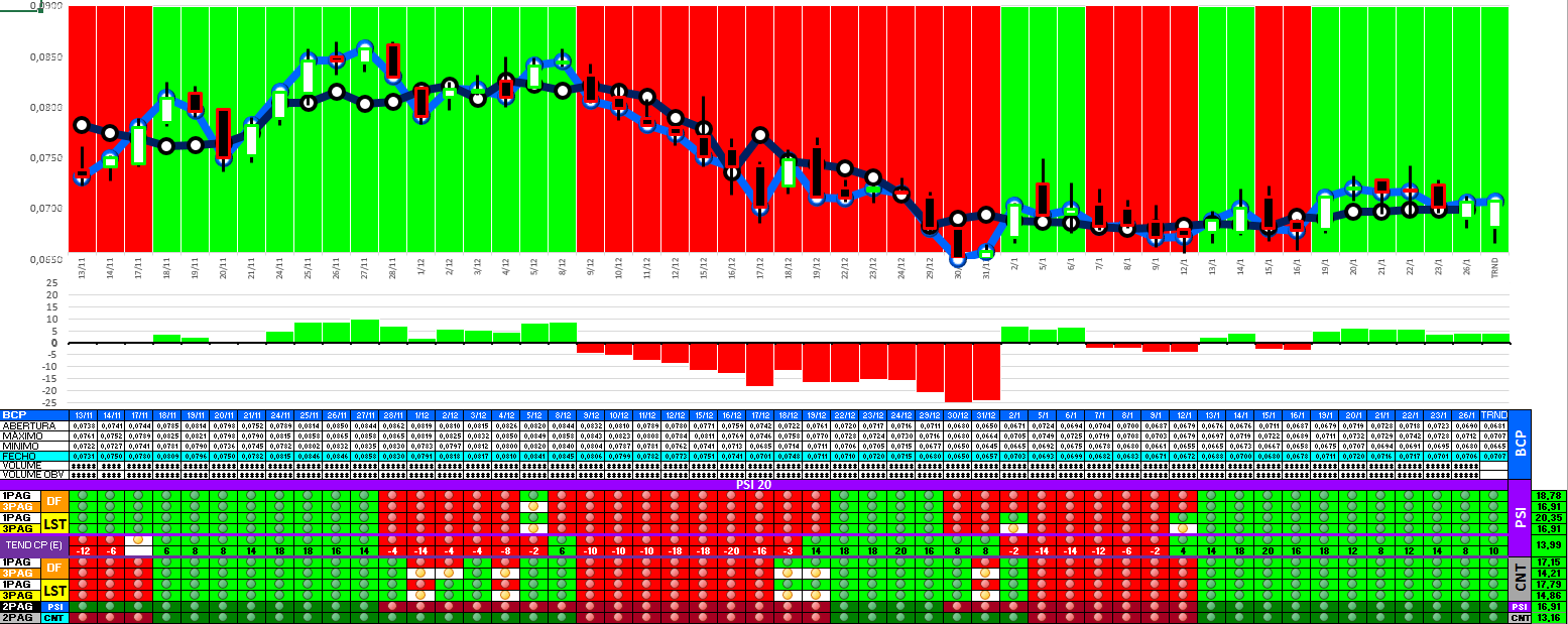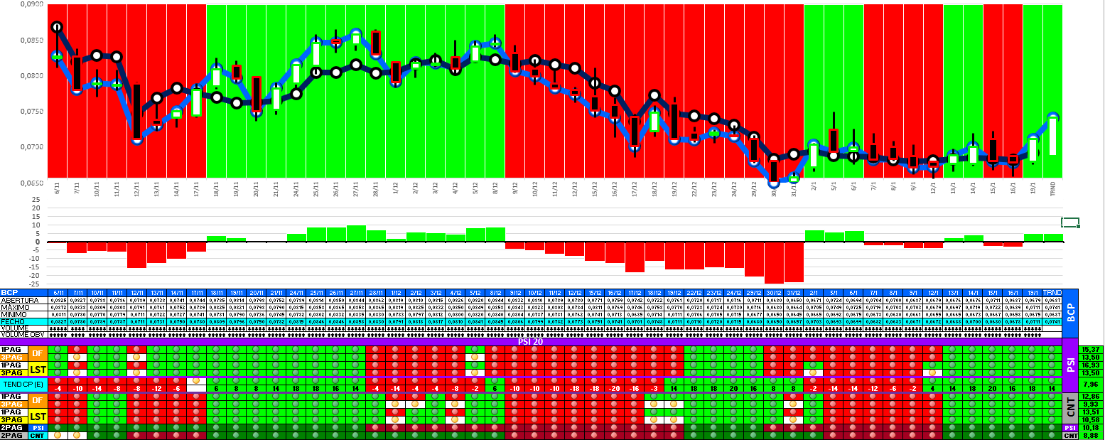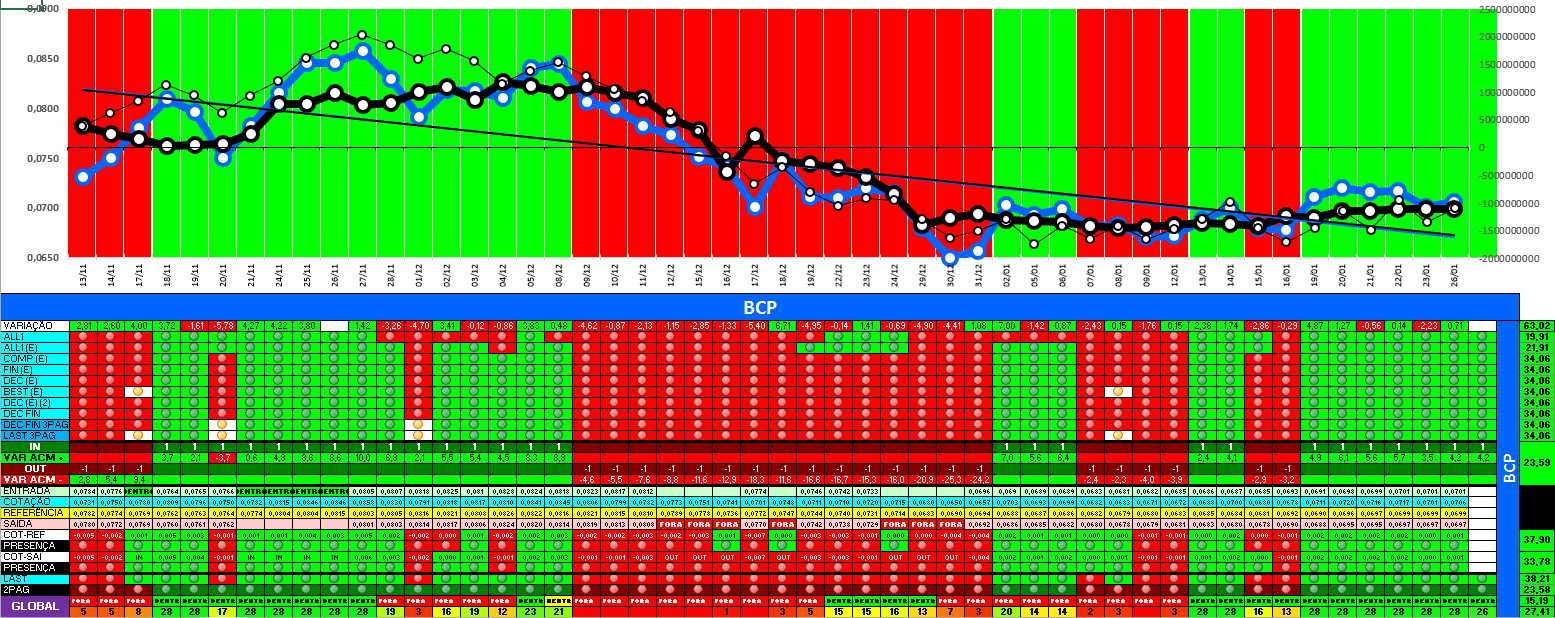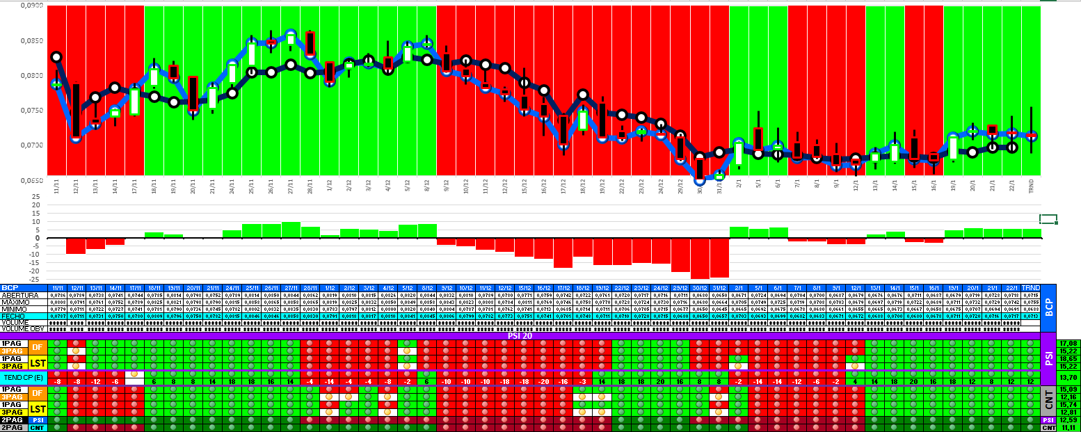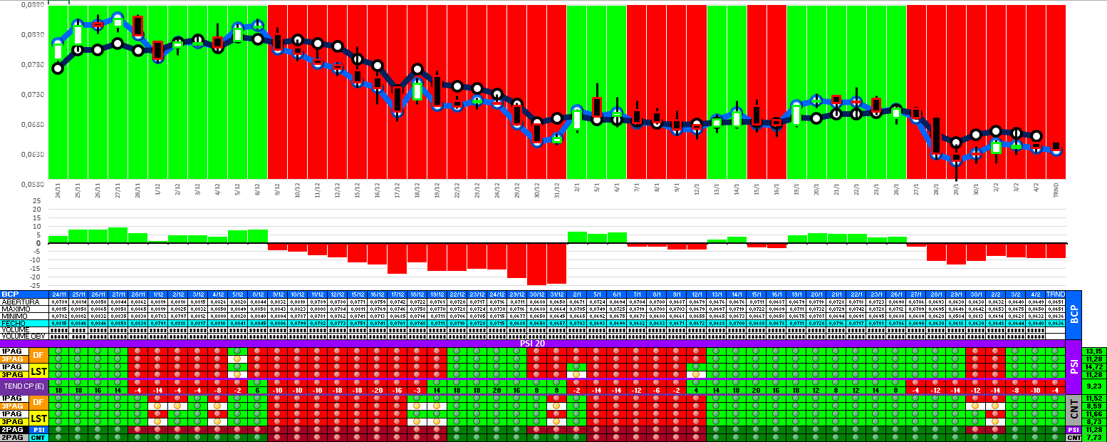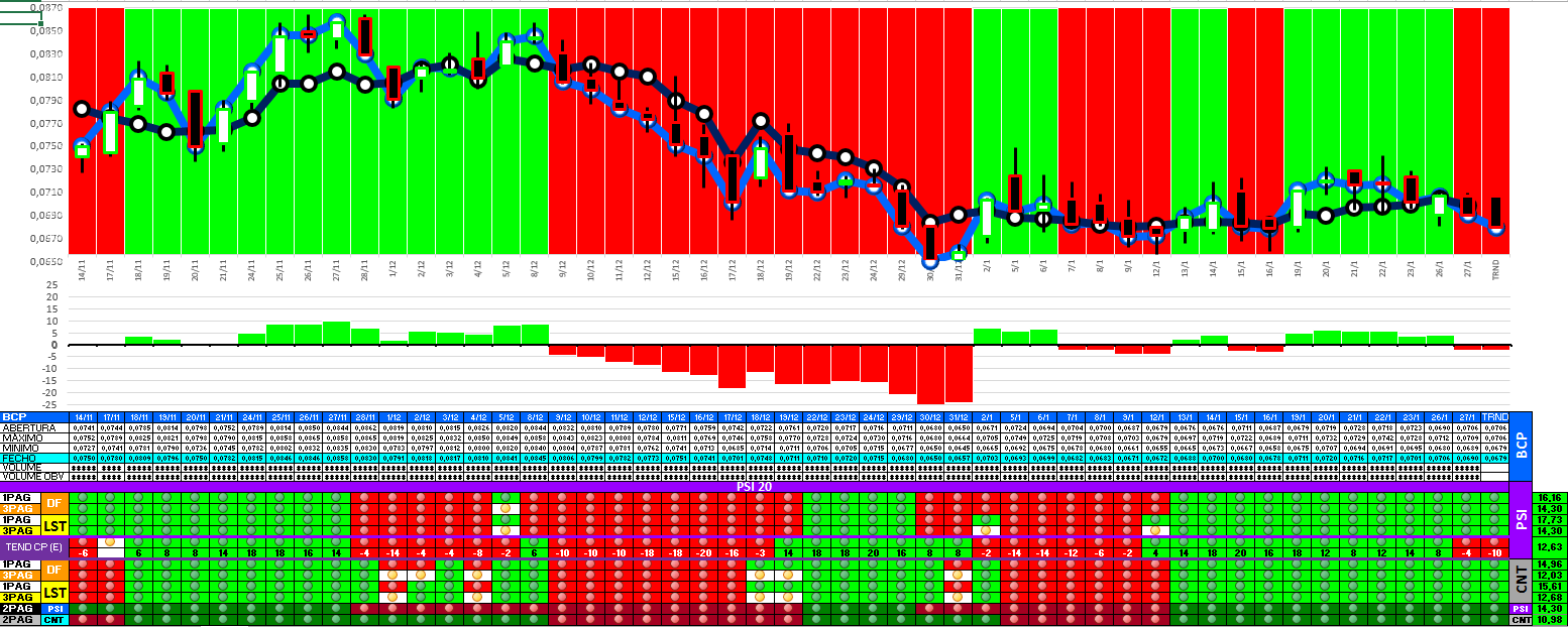 O modelo continua a dar sinal negativo para o BCP, mas nota-se uma indecisão latente. Diria que tudo depende da evolução de amanhã. Importa estar atento ao comportamento da banca (BPI e BANIF). Se o movimento positivo iniciado hoje pela globalidade dos títulos do PSI 20 tiver continuidade amanhã, então diria que estamos perante um sinal claro de entrada. Se pelo contrário, hoje foi só um fogacho, então o melhor é não entrar e continuar de fora a aguardar por melhores ventos e marés. Estamos no inverno e está muito frio para fazer windsurf