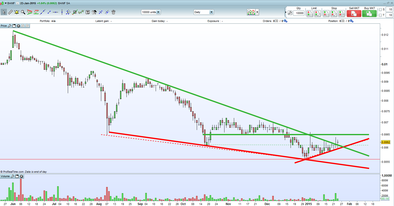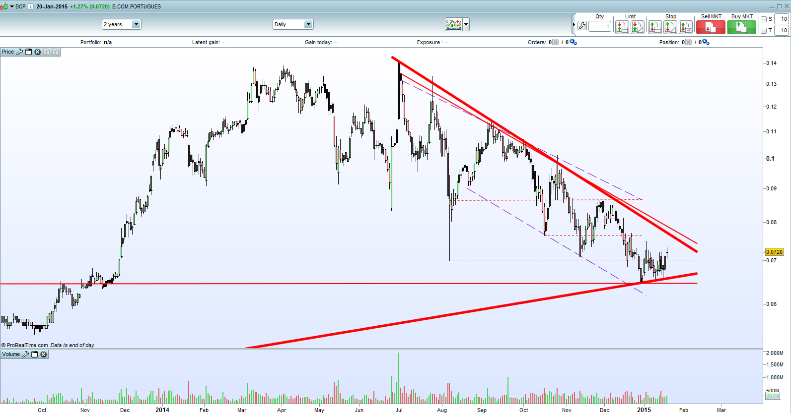Acredito que durante esta semana, atendendo à apresentação de resultados, o BPI vá puxar pela banca e o BCP vá por arrasto até ao inicio da próxima semana aquando da apresentação dos seus resultados. As expetativas do BPI são boas, mas as do BCP são muito melhores... comprar nos rumores e vender na noticia... O BANIF em termos de análise técnica também está numa situação muito promissora. À semelhança do BPI o indicador "Volume OBV" do BANIF desde o dia 13 de Jan'15 também dá sinais favoráveis. O movimento positivo combinado das 3 cotadas pode ser muuuuiiiiittto interessante