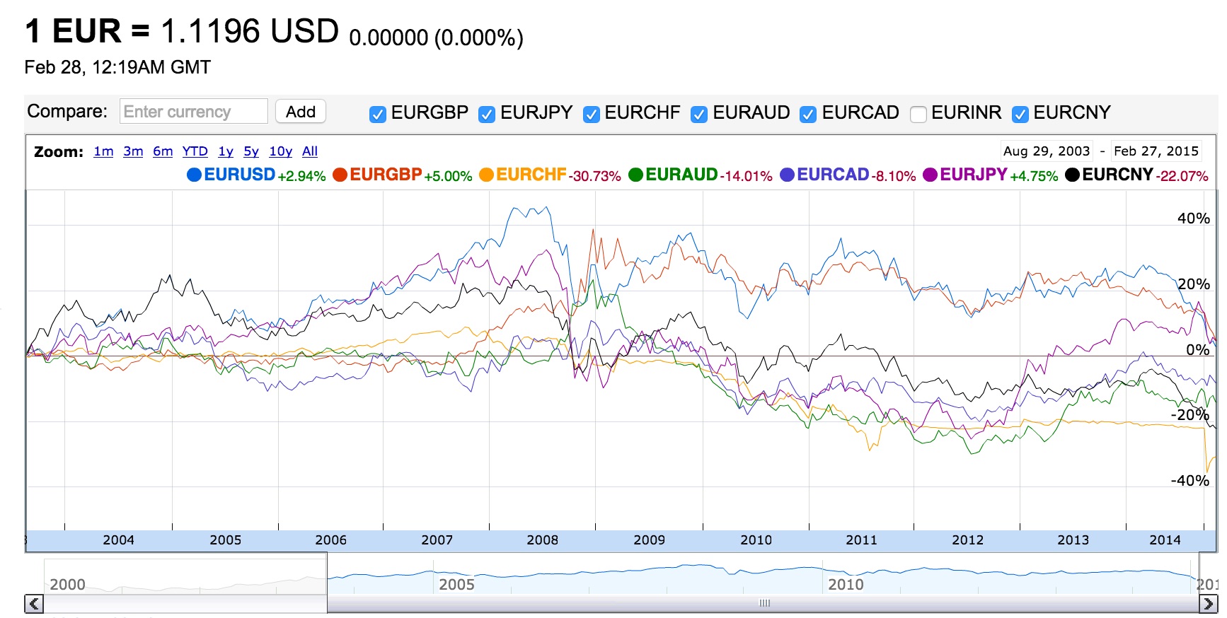 O Euro esteve mesmo a ganhar terreno a todas as divisas de referência antes da crise da dívida, mas foi um teste falhado ainda houve um vislumbre de retoma em 2013 mas o caminho neste momento parece ser para novos mínimos e isso vai certamente acabar com o que sobra do Euro, a chegada e quebra da paridade vai ser o primeiro sinal da insustentabilidade da situação.