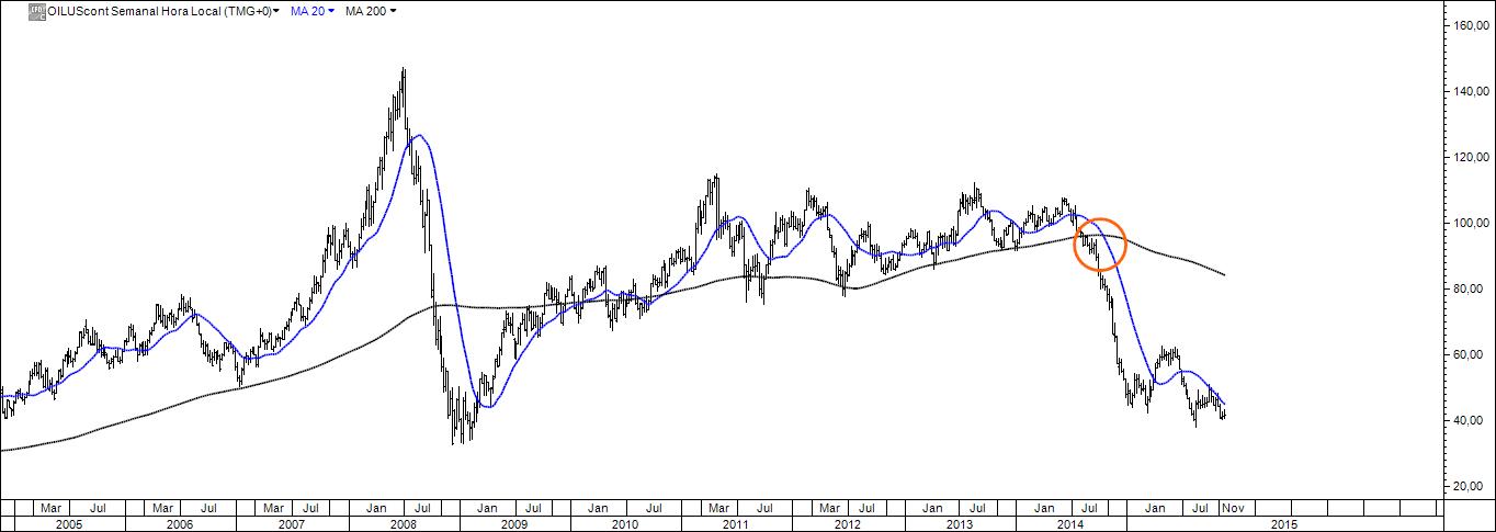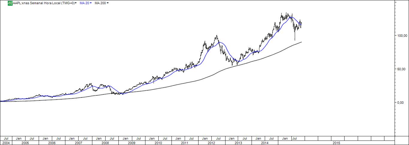 Corroboro a tua opinião segundo a qual os ganhos com um sistema tendencial minimamente afinado são bastante satisfatórios. Na verdade, um simples sistema de trading que use no gráfico semanal o cruzamento das mm 20 e 200 teria entrado curto no crude e na prata e ainda assim estaria. Se olharmos para um gráfico diário do crude, a conclusão seria a mesma, aqui com a vantagem de a entrada vendedora coincidir com a quebra de uma lta (mais uma coisa a favor do negócio). A apple num gráfico semanal é outro exemplo da bondade da técnica do cruzamento 20 x 200, mas neste caso para comprar. Compra essa que, curiosamente, ainda estaria na carteira.