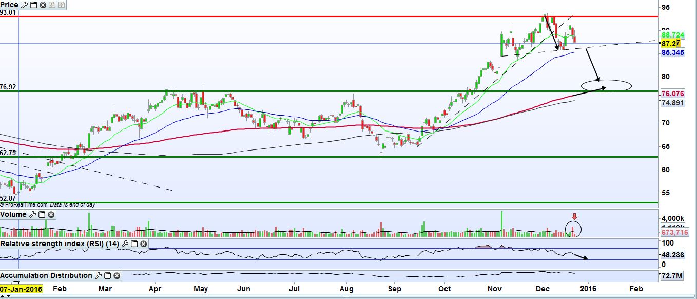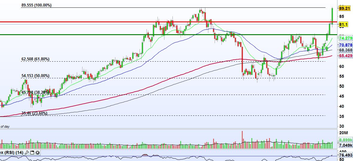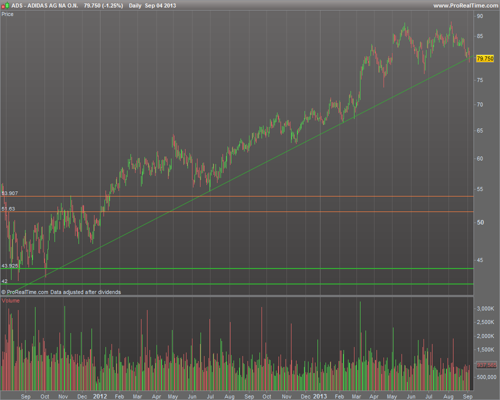 Adidas tem agora pela frente a zona de resistência dos 87.5 - se a superar, entrará em "unchartered territory".