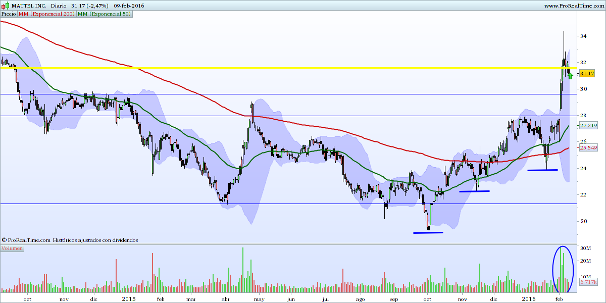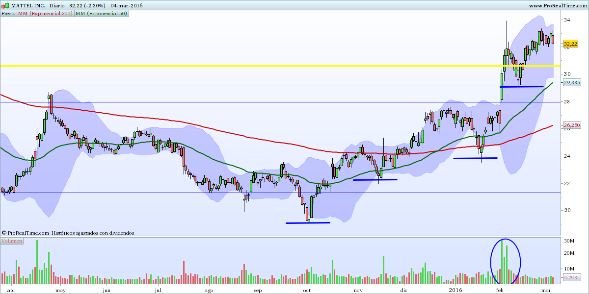 Técnicamente, viveu um bull market espetacular entre 2009-2013, depois desceu em bolsa cerca de 55%, desde o seu máximo em dezembro de 2013. A partir daí a tendência é de queda, com a cotação maioritáriamente abaixo da mm200. Temos 1 ano e 10 meses entre a dead cross e a golden cross. Desde o seu minimo em outubro de 2015, tem vindo a recuperar, ocorreu a golden cross. A zona de resistência entre 27.80-29.75 usd era a barreira principal que se acabou por quebrar nestes primeiros dias de fevereiro 2016. Temos as mm's a apontar para cima e volume a companhar o movimento.