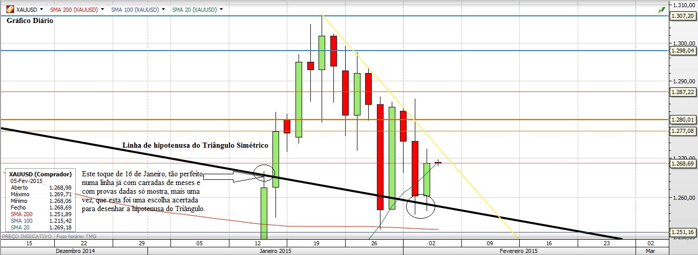 A primeira grande razão para não alterar a hipotenusa prende-se com o facto de eu ter que aceitar uma linha que me acompanha à larguíssimos meses e que tem sido, juntamente com a base do Triângulo, o meu grande guia para interpretar o movimento do Ouro. Quando percebi pela primeira vez a possibilidade do Triângulo Descendente desenhei várias hipóteses de hipotenusas mas, no final, e com o tempo, optei por esta que se tem mantido até hoje. Não alterá-la ou não escolher outra agora tem a ver com uma questão de fidelidade à figura original. Não se trata de teimosia, mas simplesmente depois de ter uma figura durante tanto tempo e me guiar por ela não posso simplesmente alterá-la. Repare na vela do dia 16 de Janeiro, não é lindo ela ter tocado quase milimetricamente na linha e depois quebrado em alta a mesma? Até esse momento não haveria duvidas. Agora o Preço anda a massacrar a linha, mas ela está-se a aguentar... a linha está a funcionar. Caso o Preço volte a entrar novamente para dentro do Triângulo a conclusão que retirarei é simples: O triângulo não funcionou como figura no sentido de projectar o Preço para um determinado patamar, mas funcionou para me balizar dentro das linhas que o compõe e ai, não me posso queixar.