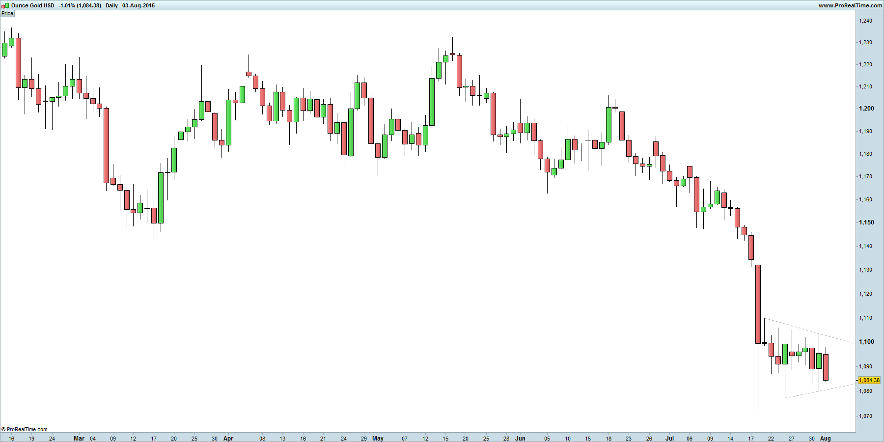para os entusiastas dos padrões triangulares: o ouro desenha um padrão de continuação (das quedas) na forma de um pendão