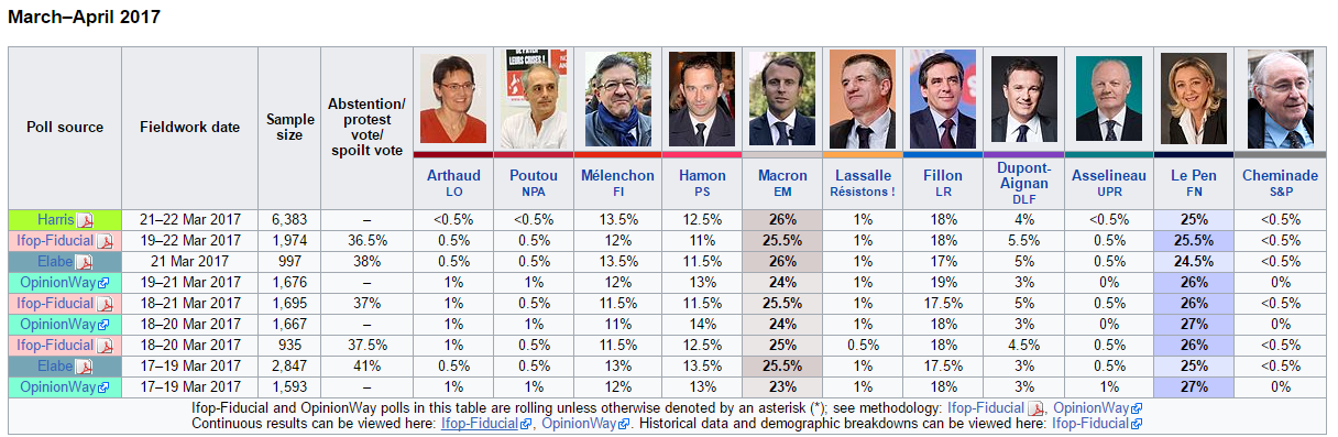 A única coisa que tem mudado em meses, é a subida do Melenchon (esquerda radical), à custa do Hamon (PS), ainda assim na disputa do 3º lugar.