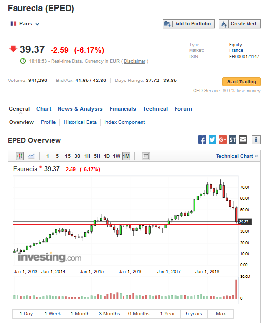 A Faurecia cai hoje mais de 6% e aproxima-se de um suporte importante, para já não diria que está em Bear.