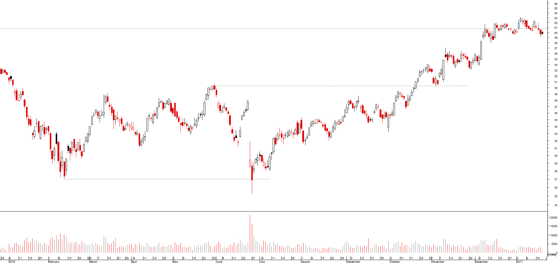 Tocou nos 63€ no inicio de 2017, desde de 2008 que não cotava tão alto. Será que poderá estar lançada esta acção para novos voos?