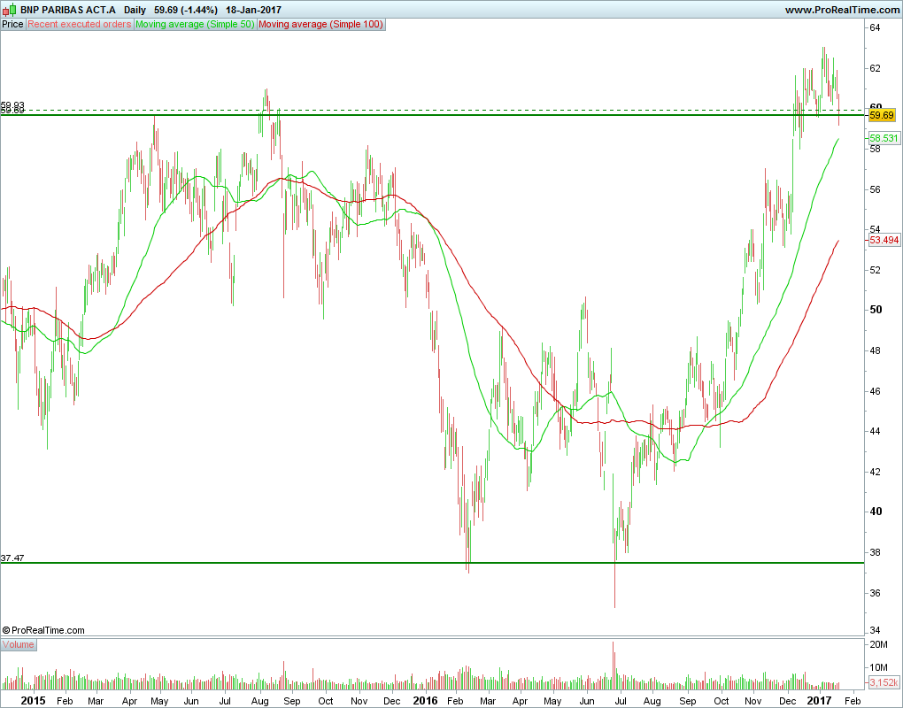 O BNP tem as condições necessárias para chegar perto dos 63€ no início do ano de 2016. Com efeito, há uma linha ascendente que vem desde junho de 2012 e está ainda válida e as mm vão ficar alinhadas numa posição bastante positiva.