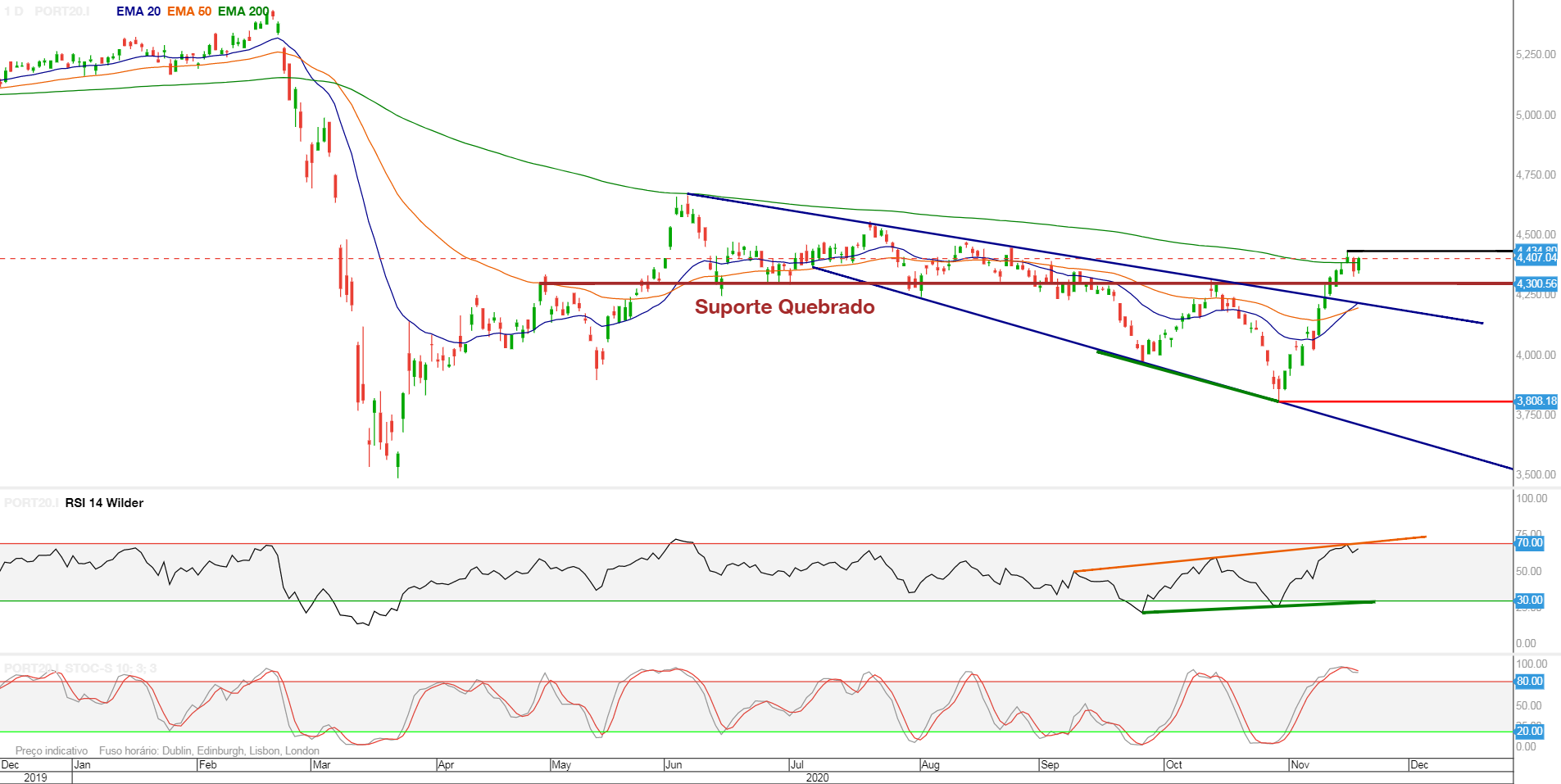 Muito interessante o actual momento do PSI. Com a quebra da resistência na zona dos 4300 pontos, o PSI galgou terreno bem forte. Está numa situação curiosa porque "sente-se" a vontade do PSI subir, mesmo quando as Bolsas europeias estão mais mornas ou com correcções ligeiras, A questão aqui é o PSI estar já "sobrecomprado" e próximo do máximo relativo dos últimos 9 meses que foi de 4678 pontos. É difícil ultrapassar essa zona sem uma consolidação/retracção anterior a esse ataque.