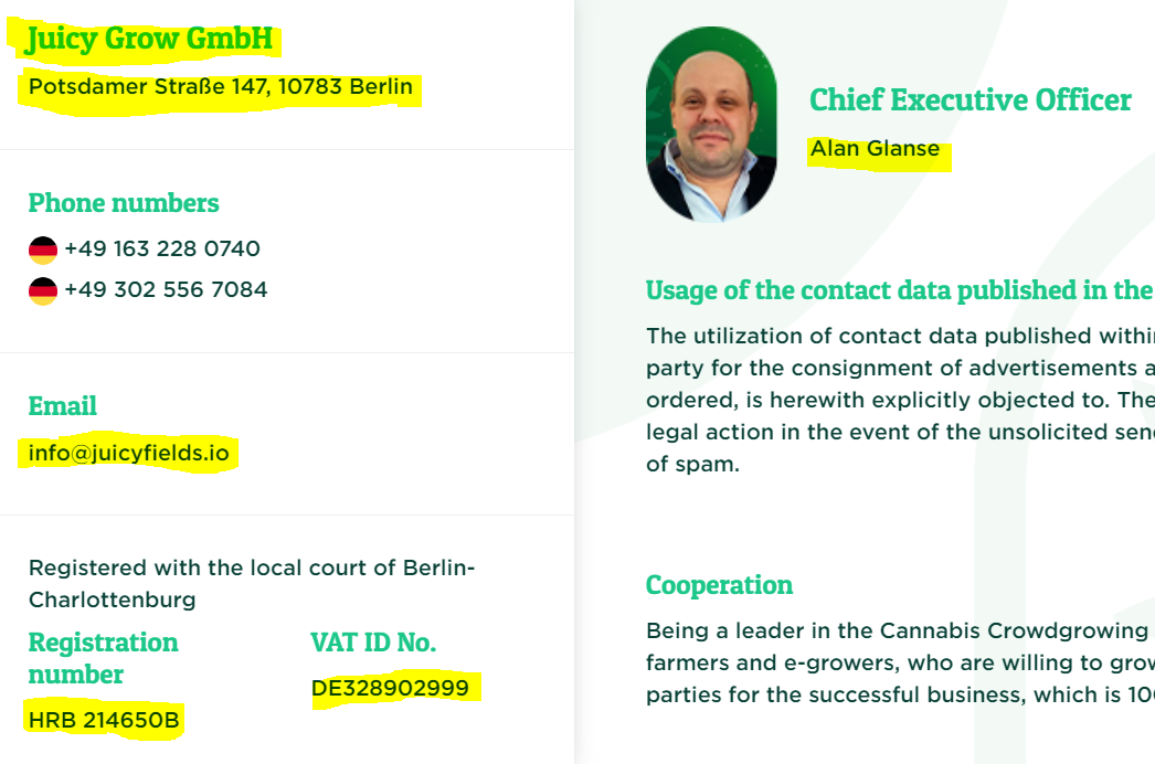 Este website é detido pela Juicy Grow, essa sim a empresa, cujo número de registo é o HRB 214650 (B) onde o B julgo que corresponde a uma actualização que já ocorreu ao registo original. Esta empresa terá sido formalmente criada em Fevereiro de 2020 e o processo iniciado em Outubro de 2019.