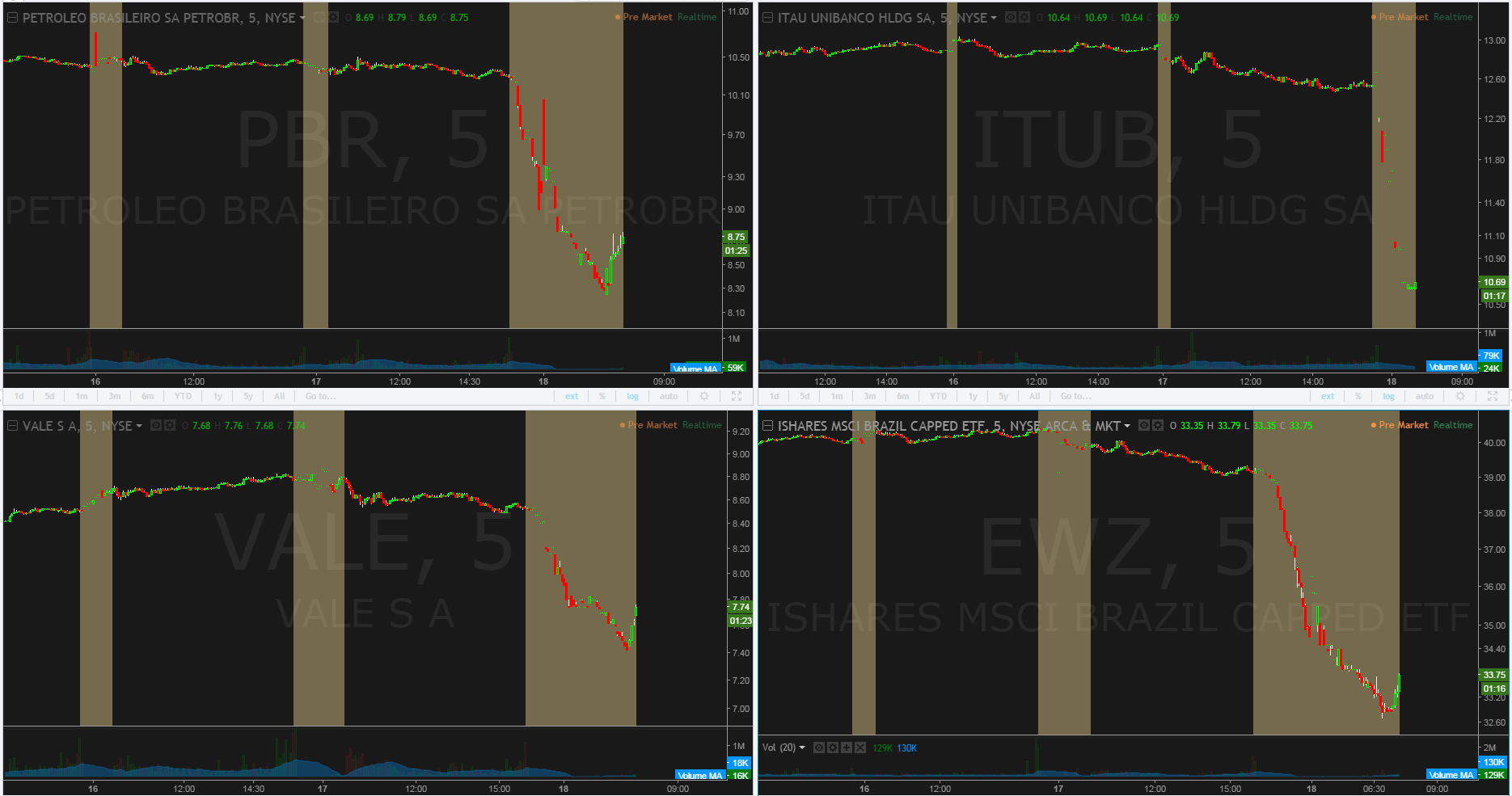 O ETF que reúne os papéis brasileiros negociados nos EUA, iShares MSCI Brazil Capped (NYSE:EWZ), perde 16% e vai a US$ 32,90, menor valor do ano.