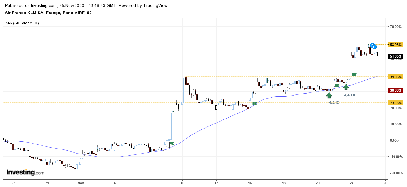 Depois duma queda abrupta de 24%, a KLM subiu mais de 30% em mês e meio, estando de novo em maximos.