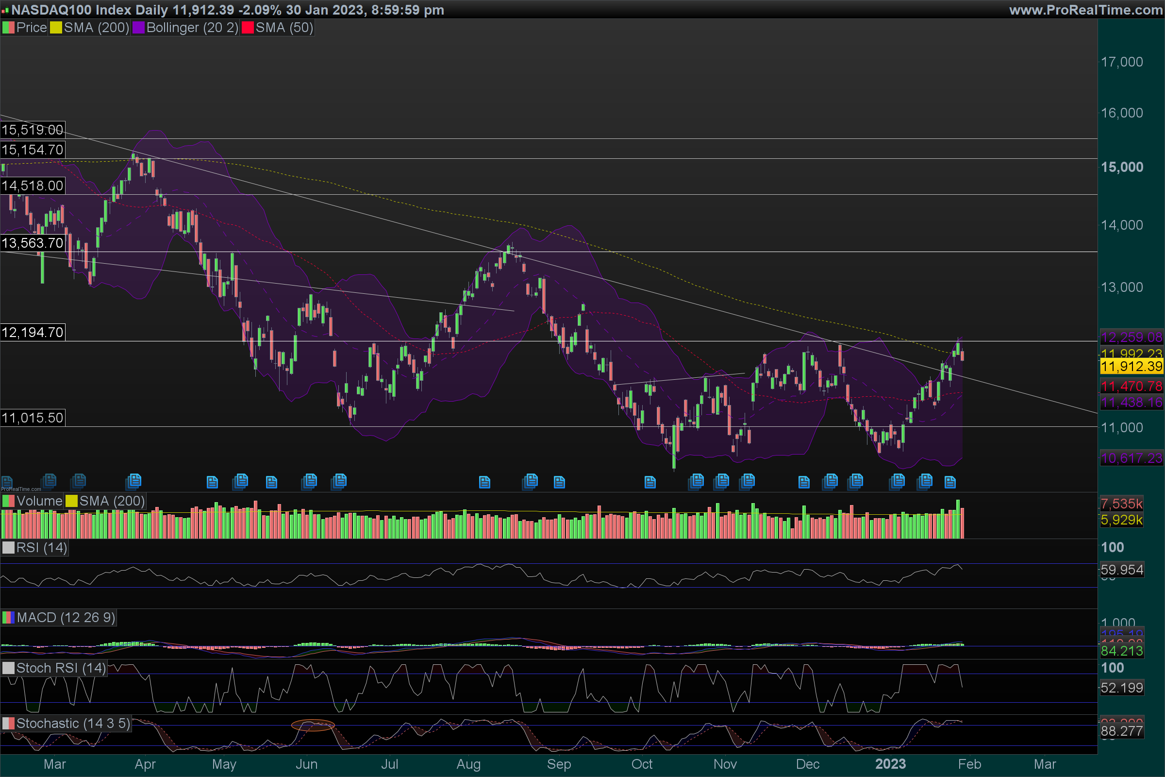 Dow Jones, 4º toque na Linha de Tendência Descendente, que acompanha o índice em todo o ano de 2022.