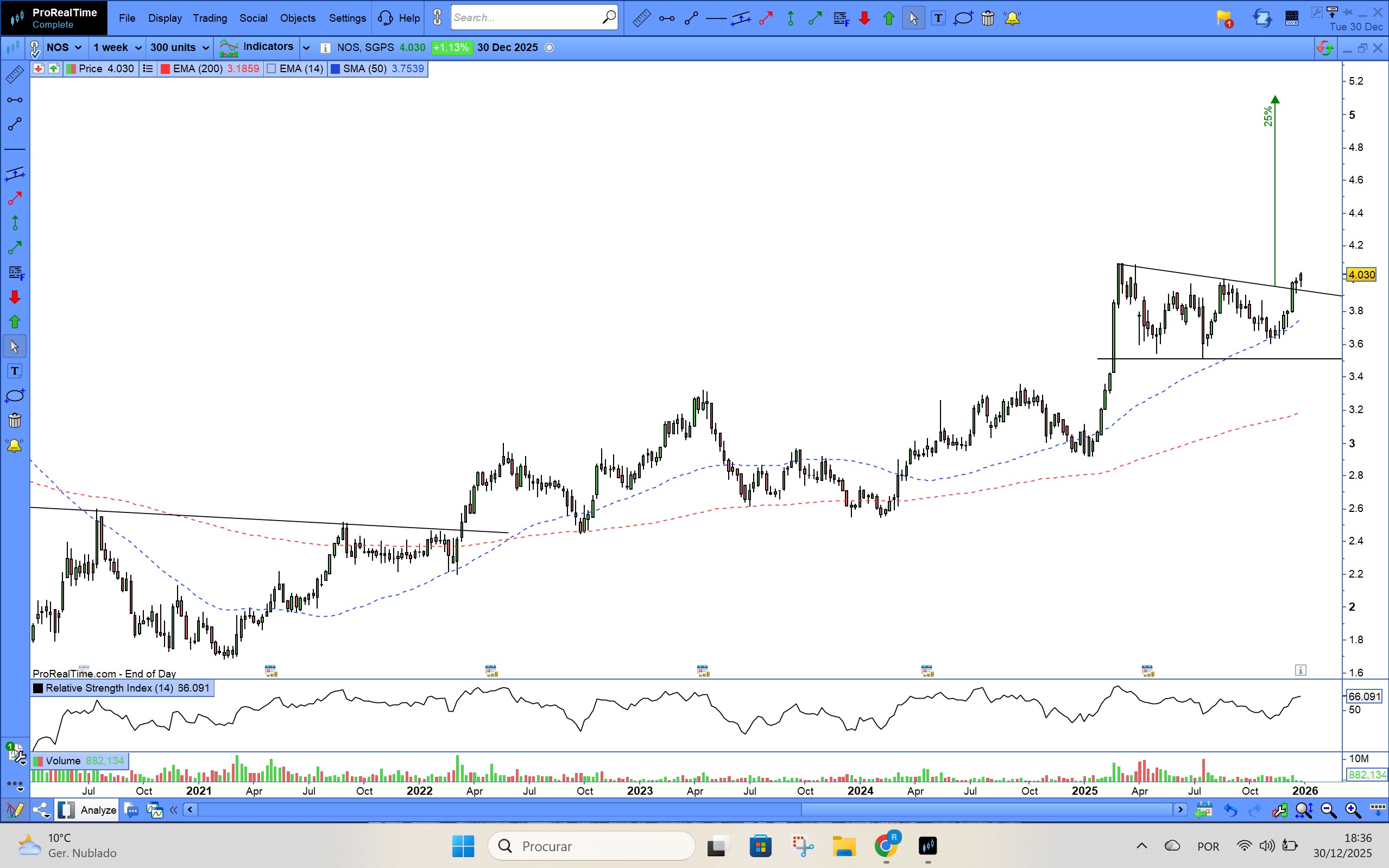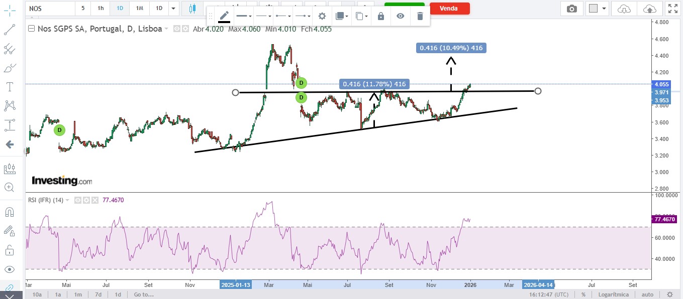 Como tínhamos uma lateralização entre 3,60 e 4 euros, faz assim sentido duplamente um target nos 4,40. E depois iria subindo mais sossegada aos 4,75 até Abril.