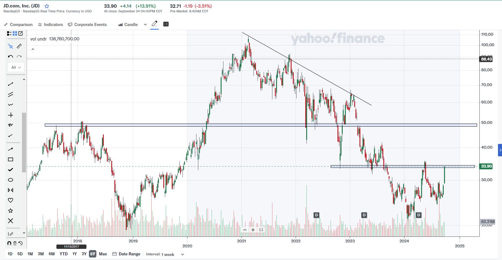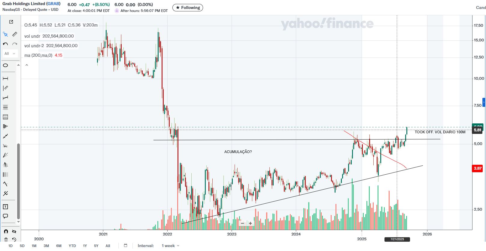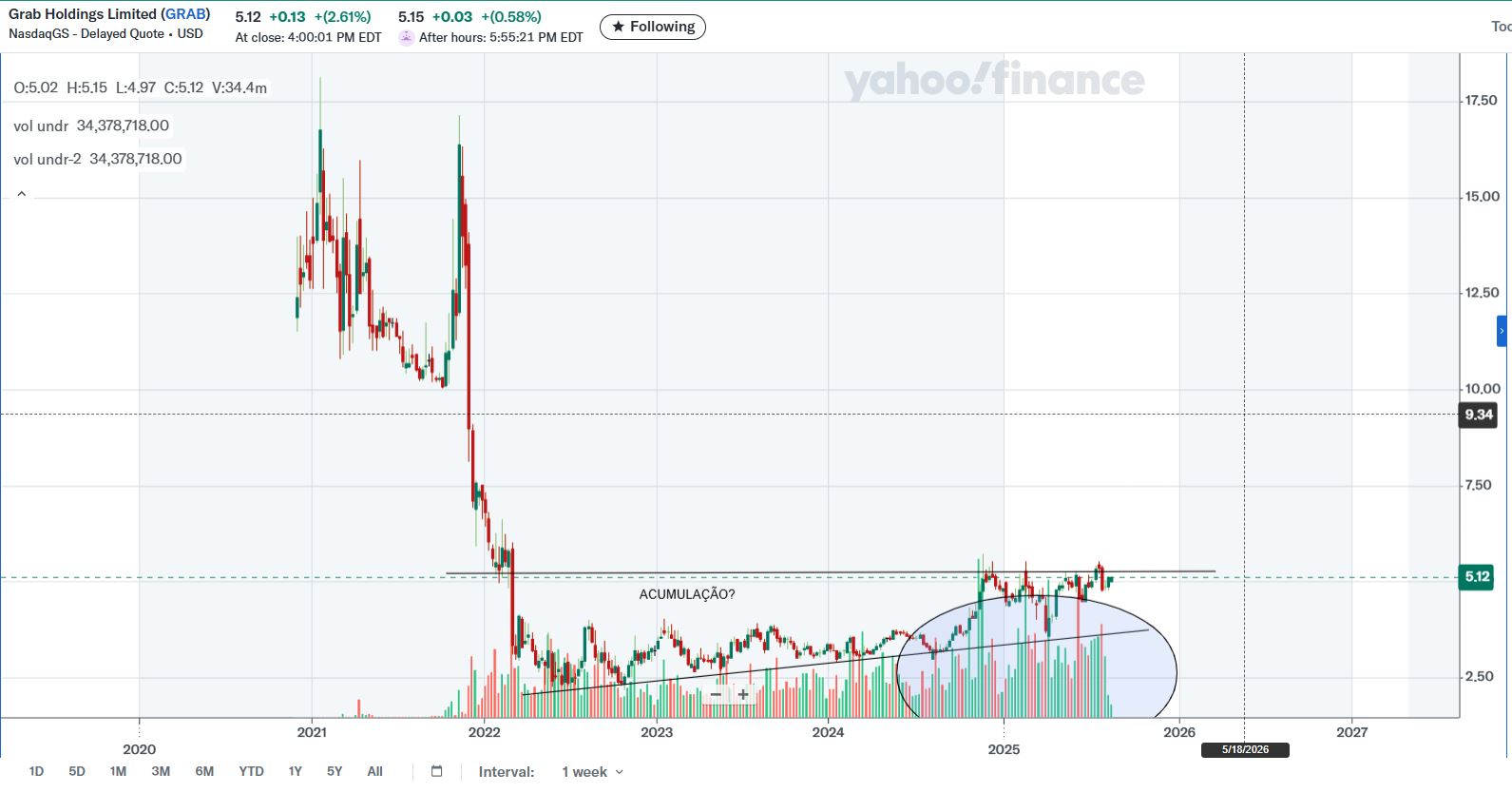 O tópico está mais morto que vivo, pessoalmente tenho feito quase zero de trading, porém deixo aqui uma trading idea com a GRAB após dar uma olhada ao gráfico semanal da mesma.