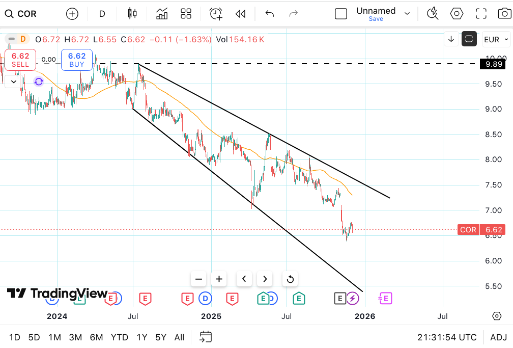 (Já agora, este é o gráfico mensal ajustado por dividendos, e o gráfico anterior da COR é o gráfico diário sem ajuste por dividendos)