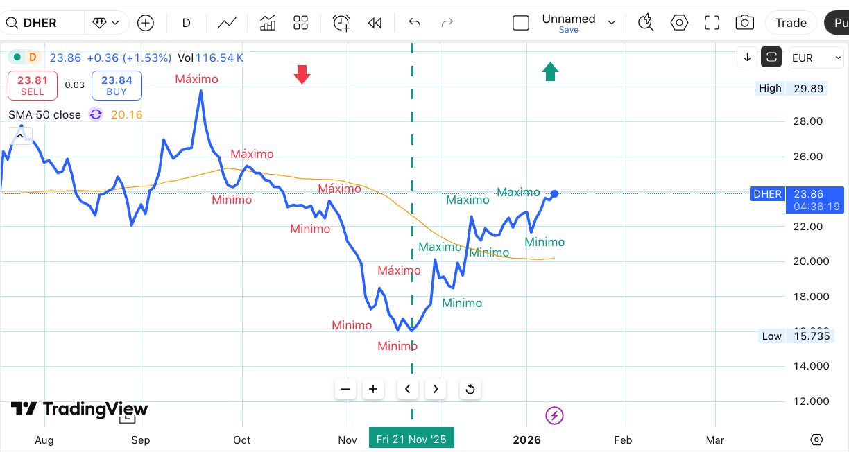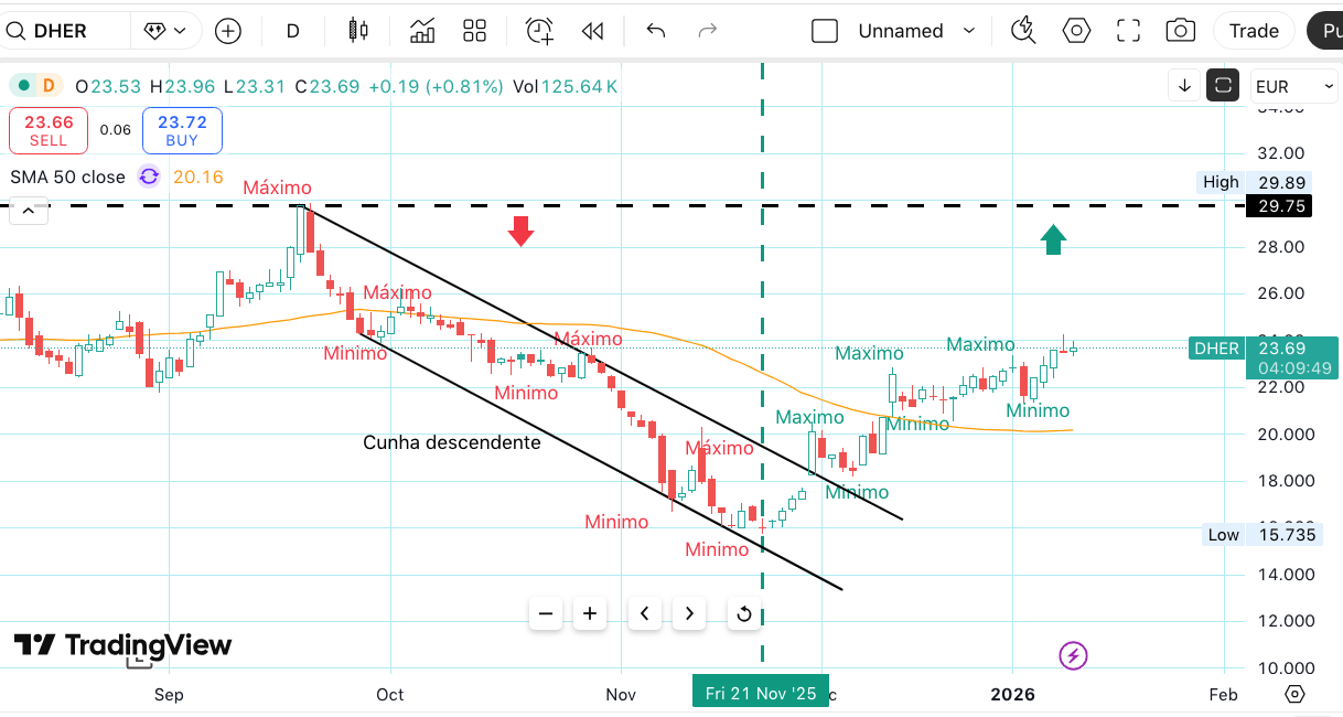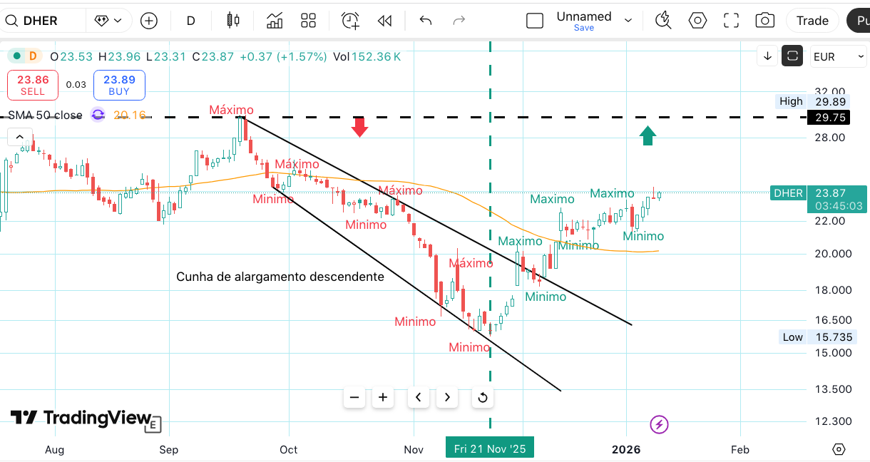 Sobre as cunhas, foram desenhadas a primeira vez no ano passado ou no início do ano, com exceção da EGL e da COR. Algumas desenhei cedo de mais, mas às vezes é difícil ver quando a subida vai começar. Apenas ajustei os objetivos porque usei gráficos ajustados por dividendos. Na COR, a cunha atual é diferente da que tinha antes. Na anterior usei o gráfico ajustado por dividendos mas agora preferi o não ajustado, mas a direção aponta no mesmo sentido.