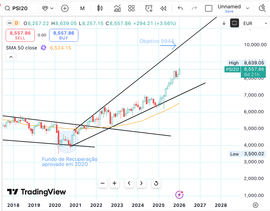 Tenho este gráfico há já uns anos e, todos os meses, aumento o objetivo. Por isso parece que nunca vai ser atingido, mas acho que um dia vai acontecer. A única pena é que, durante este tempo, não existirem ETFs para o PSI. Se houvesse ETFs 2x ou 3x, eu teria comprado
