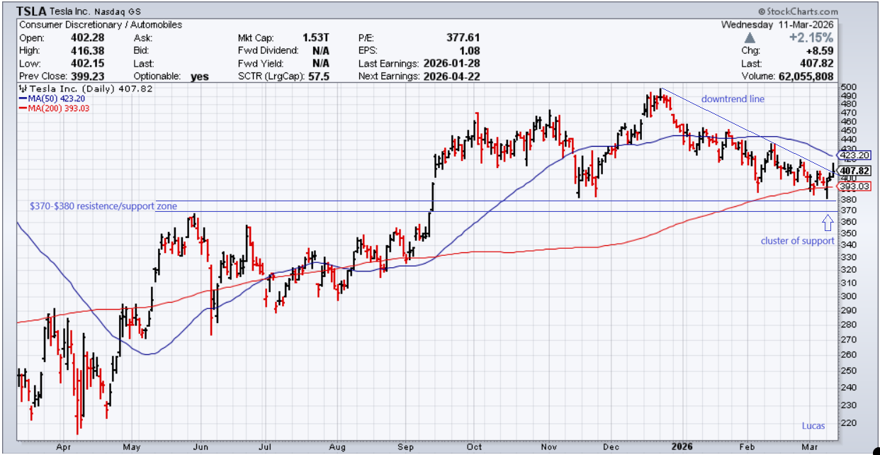 a tesla encontra-se em bullish mode depois de ter ganho o cluster de suportes que tem em torno da zona de resistência/suporte dos $370-$380 e da sua média móvel de 200 dias. de referir também que na sessão de hoje ganhou a downtrend line que vinha a desenvolver desde dezembro do ano passado. factos técnicos bullish.