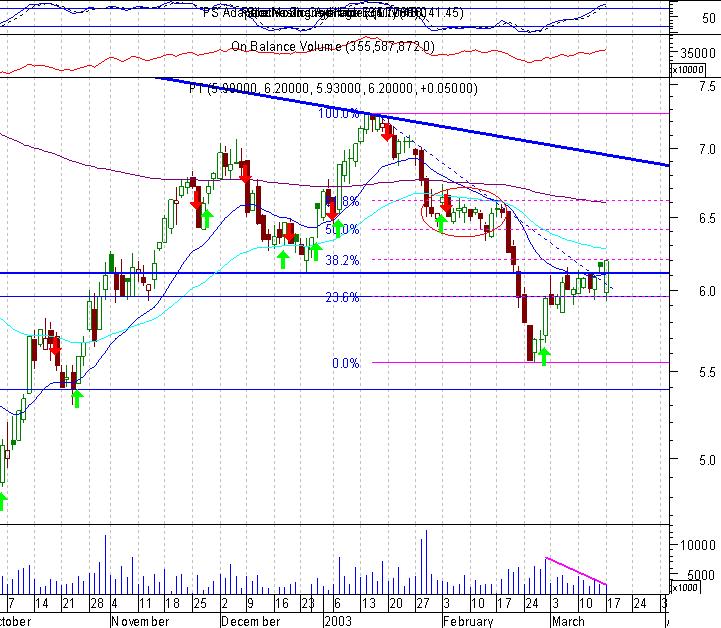 Poderão dizer que o stop era demasiado apertado, poderei até concordar com isso, mas toda a minha estratégia estava baseada naquele padrão de barras e o que a PT fez hoje nunca poderia ter acontecido. Para "piorar" a situação, o movimento descendente produzido na parte da manhã deixou intacto aquele uptrend, deixando a PT sob um forte movimento ascendente. Temos neste momento 3 higher highs e este padrão poderá ser resolvido com um forte e rápido movimento ascendente. Neste momento, acima dos 6.20 euros, o valor mais importante são os 6.40 euros, os 50% de retracement desde os highs de Janeiro.