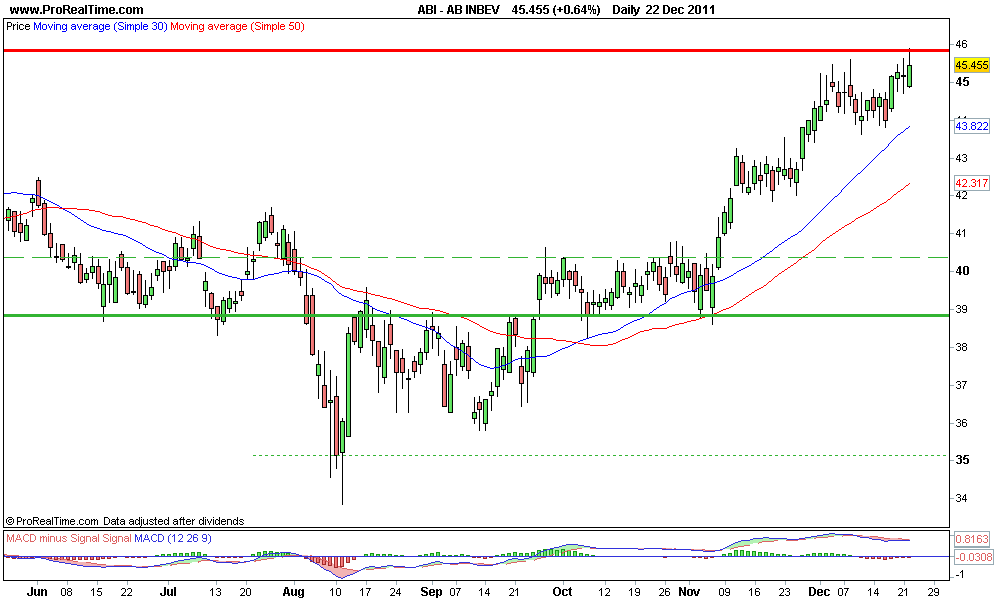 Estes dias surgiu-me o alerta para uma cotada que havia sido reportada na segunda página do tópico pelo Mklop, a AmerisourceBergen ( ABC:xnys). Cotada do SP500, está neste momento em máximos de sempre e a tentar quebrar em alta a resistencia que vem desde Junho 2011. Há também a nota um belo suporte junto da zona dos 36$.
