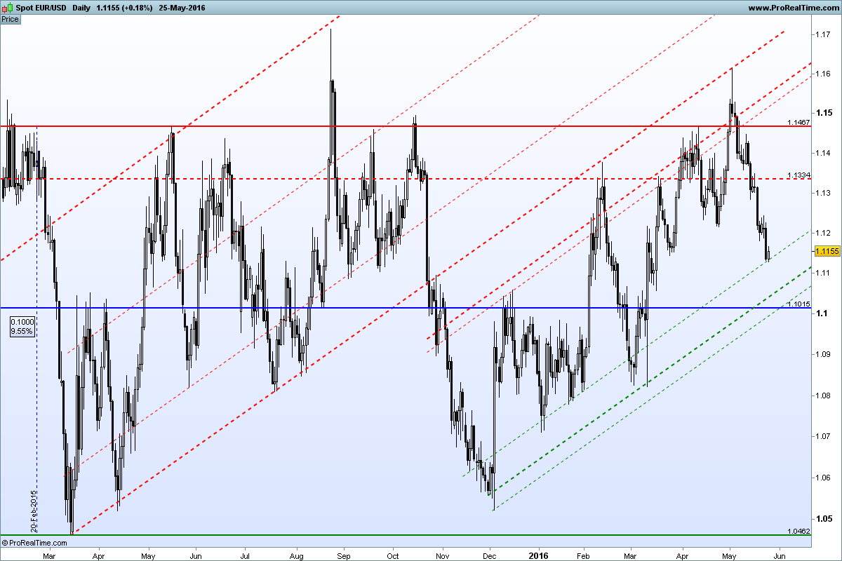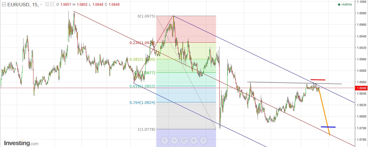 entrei curto há pouco no eur/usd, com stop e target nos marcos azul e vermelho.