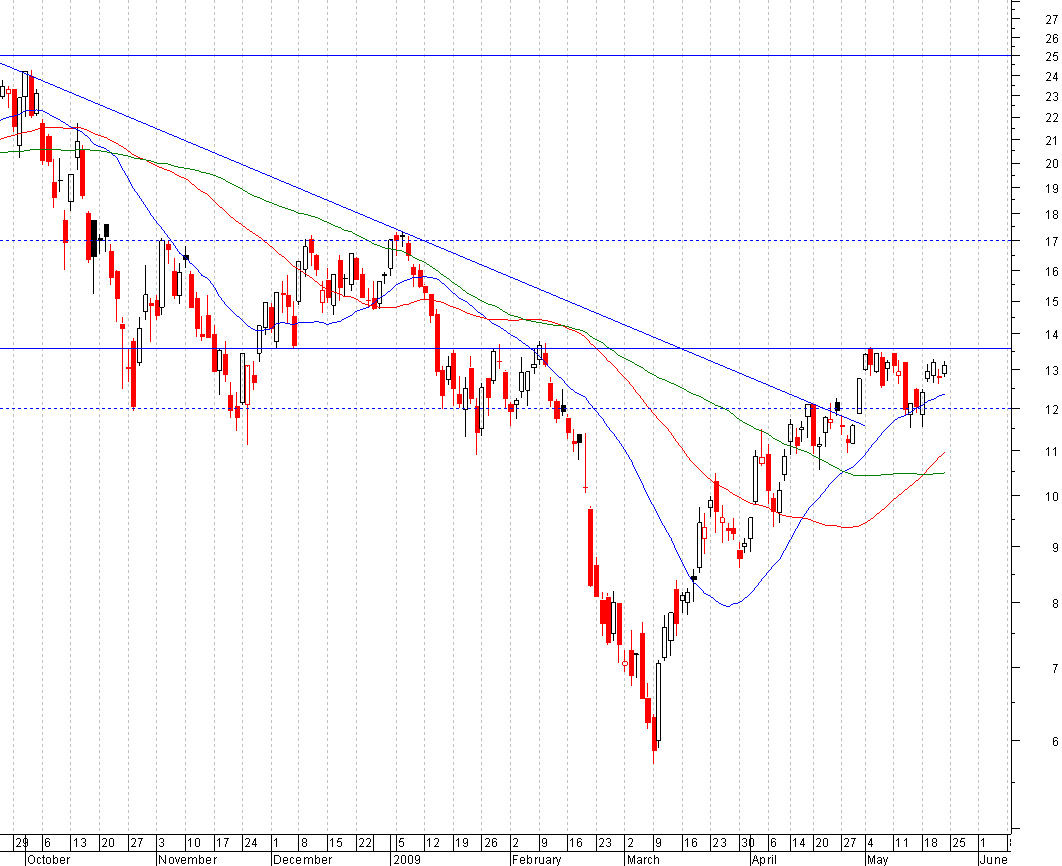 O título está com uma tendência mal definida. Tem uma óbvia resistência nos 17 euros mais ainda não chegou lá. Há também uma resistência descendente "mal amanhada" que anda agora pelos 14.