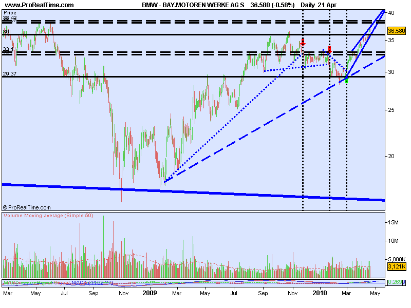 Saí da Accor diminuindo a minha exposição no CAC fazendo mais valias e coloco uma bandeirola no DAX, nesta, a meu ver muito prometedora BMW. É certo que tem ali desenhada uma cunha ascendente mas o objectivo é mesmo aproveitar-me dela.