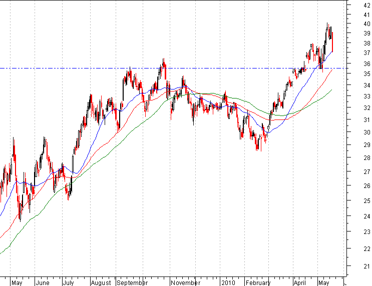 Vejo um suporte na zona dos 35,5 - esta zona serviu de resistência desde Setembro de 2009 a Abril de 2010, tendo sido vencida (com breakout) no dia 20 de Abril.