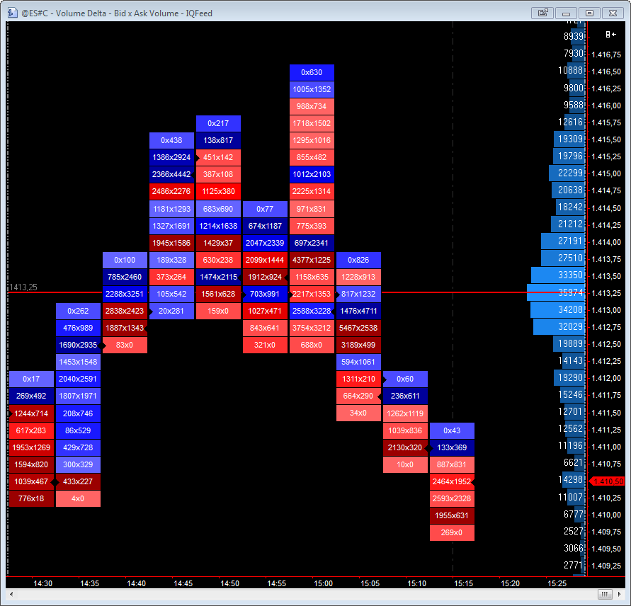 Podes também usar footprint charts onde podes ver o volume negociado no bid e no ask em cada barra de preços, podendo assim facilmente saberes zonas onde houve ou não interesse comprador ou vendedor.