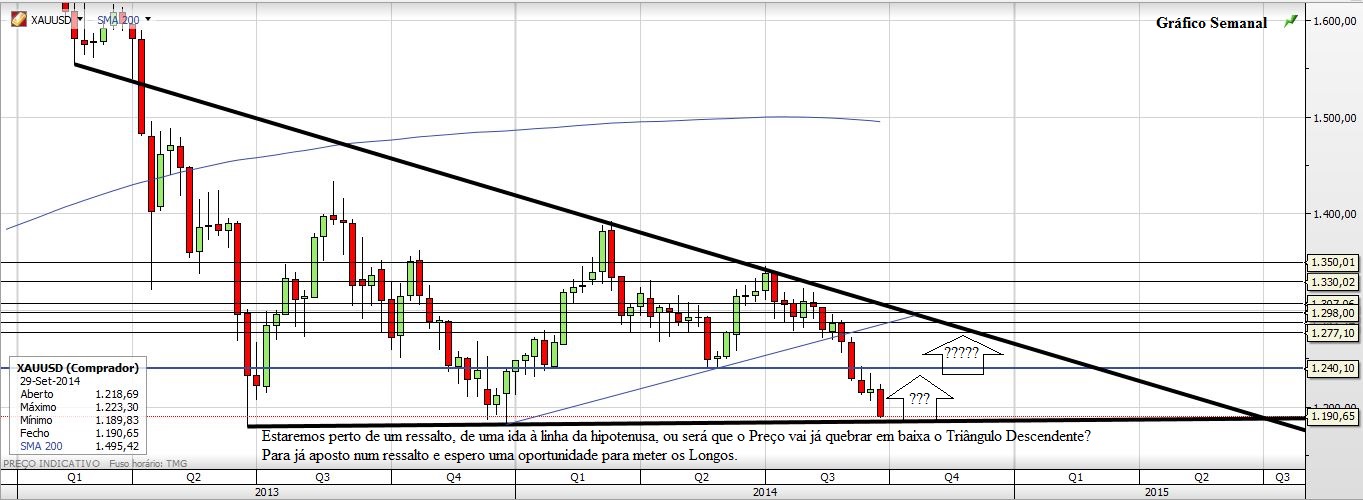 A minha ideia inicial relativamente ao Ouro era fechar Curtos na base do Triângulo e ai os abrir Longos. Está visto que o Preço está quase na base do Triângulo, mas os Curtos (grossos) já não estão comigo desde os 1214. Repescando a minha ideia inicial estará quase a chegar o momento de meter os Longos. A descrença no Ouro é total, vamos ver o que o Preço vai fazer, mas estou muito inclinado para começar a meter Longos.