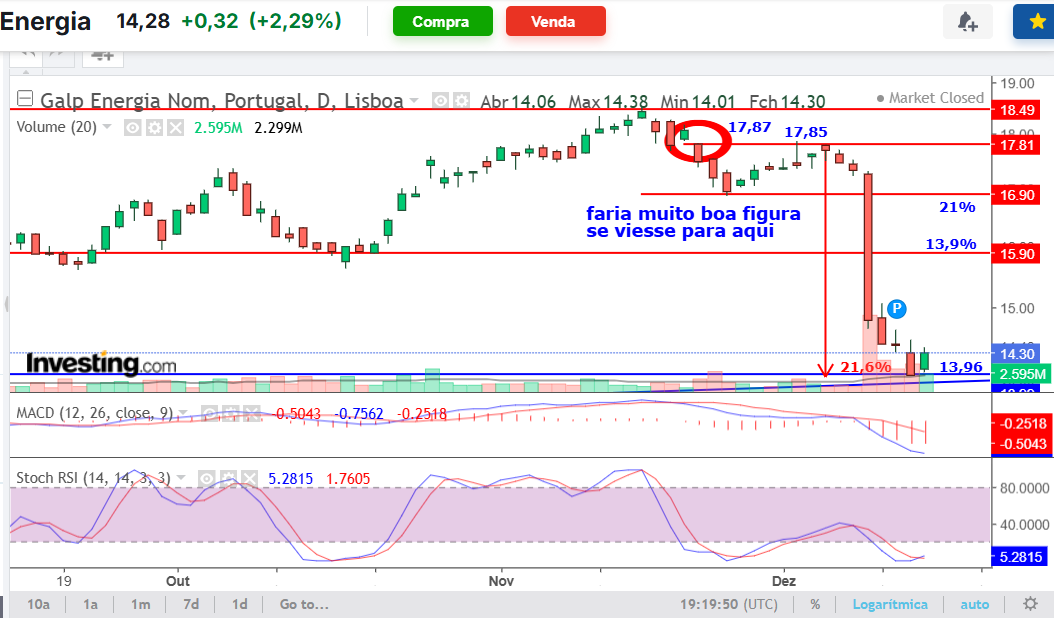 Revendo o gráfico em time frame diário, o gap mais relevante continua a situar-se na zona dos 19,6€. É um gap em gráfico diário, com muito mais peso técnico do que gaps intraday ou de 1 minuto, sobretudo depois de um movimento de queda violento como o que tivemos recentemente.