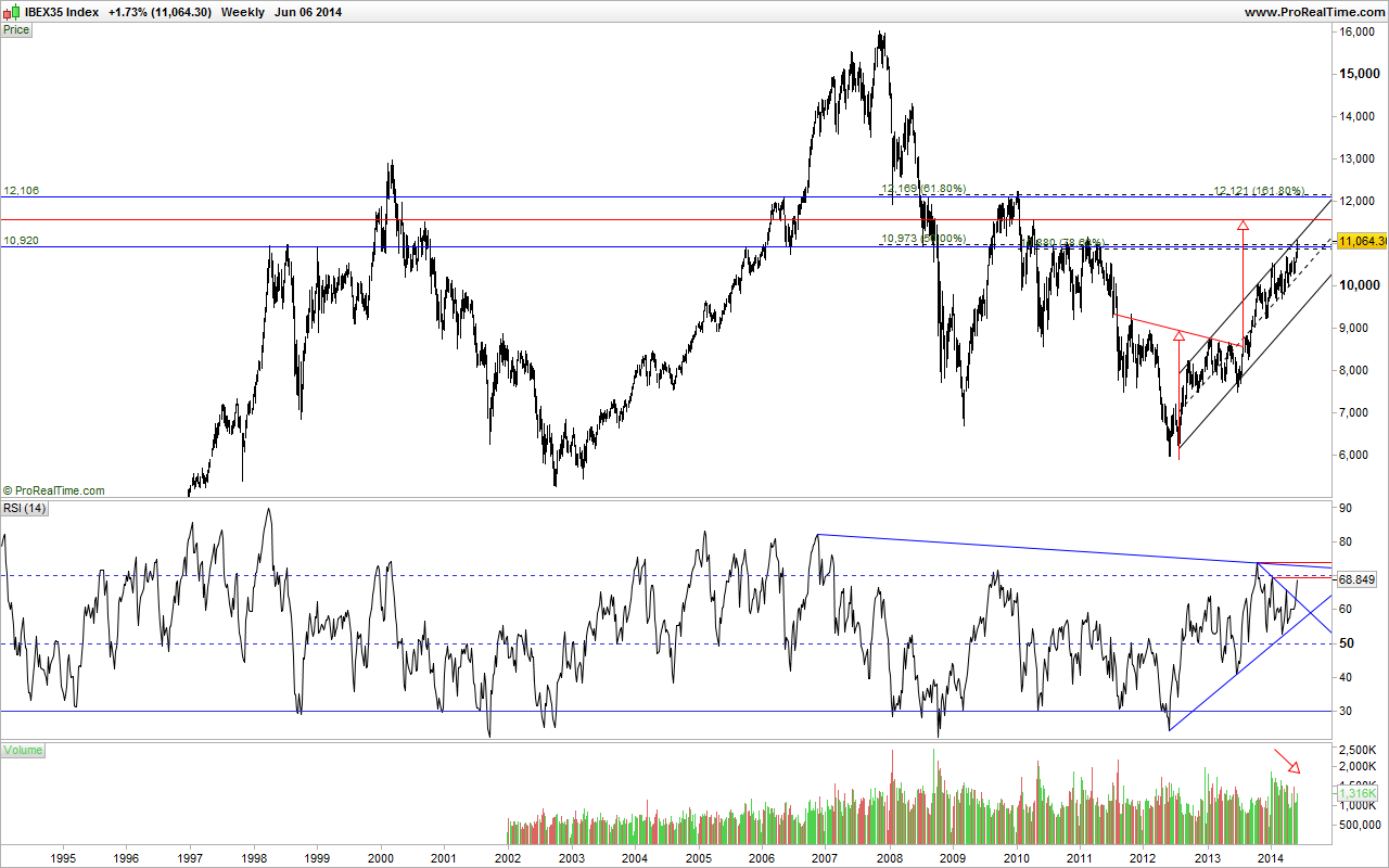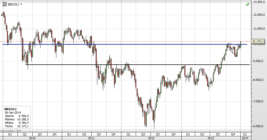 O IBEX deu um forte sinal técnico em Agosto de 2013, quando rompeu em alta a LTD de longo prazo que vinha do final de 2007.