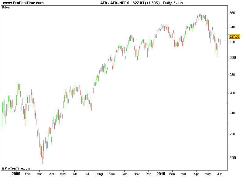 Tal como os seus congéneres, o índice holandês subiu fortemente durante cerca de um ano. Contudo, encontra-se numa fase de lateralização que já vem do final de 2009 (apanhou a fase final das subidas).