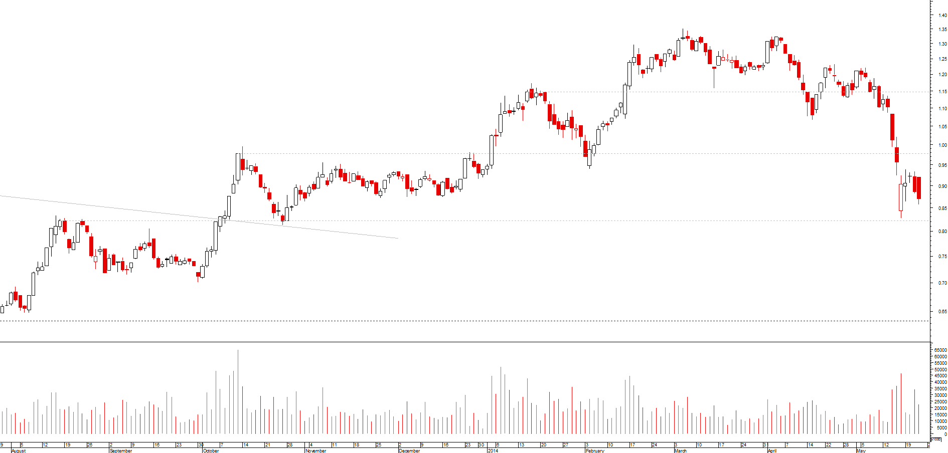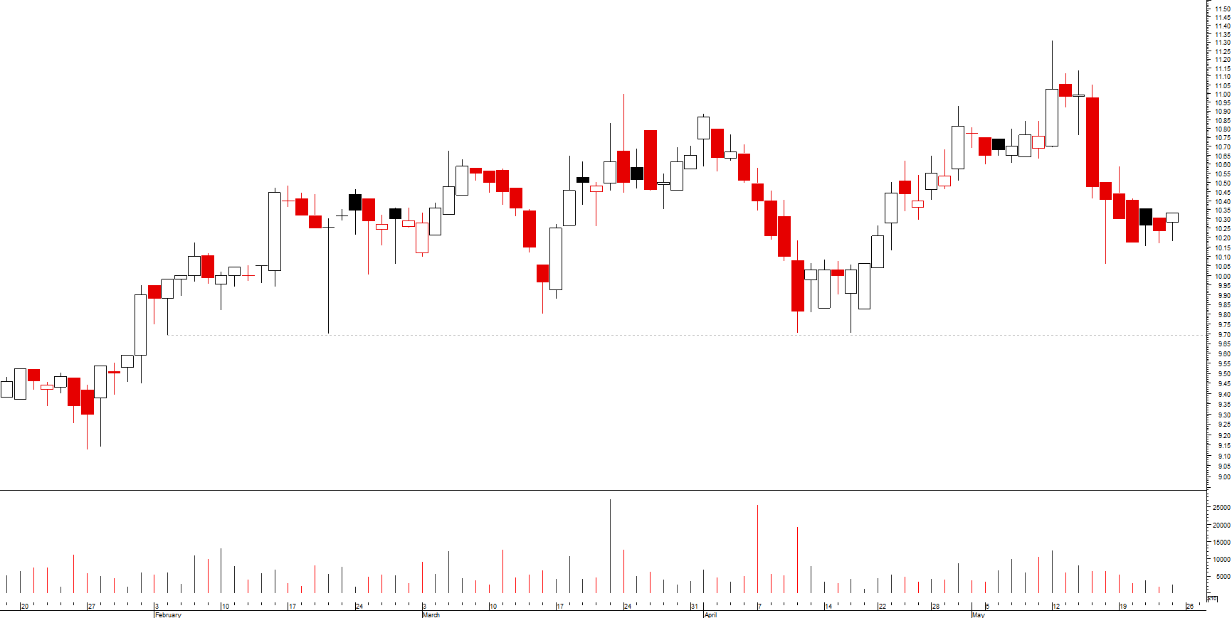 se, por um lado, desde o máximo de março, se assiste a uma toada de fundos e altos sucessivamente mais baixos, o que revela uma tendência descendente, ainda que secundária, por outro lado a cotada encontra-se momentaneamente sobre um suporte local e acabou de desenhar um padrão de velas de inversão da tendência de curto prazo (martelo)