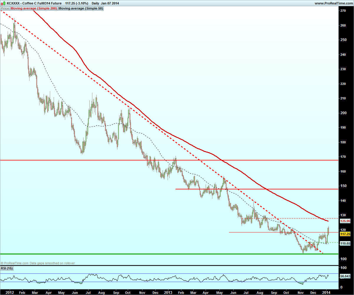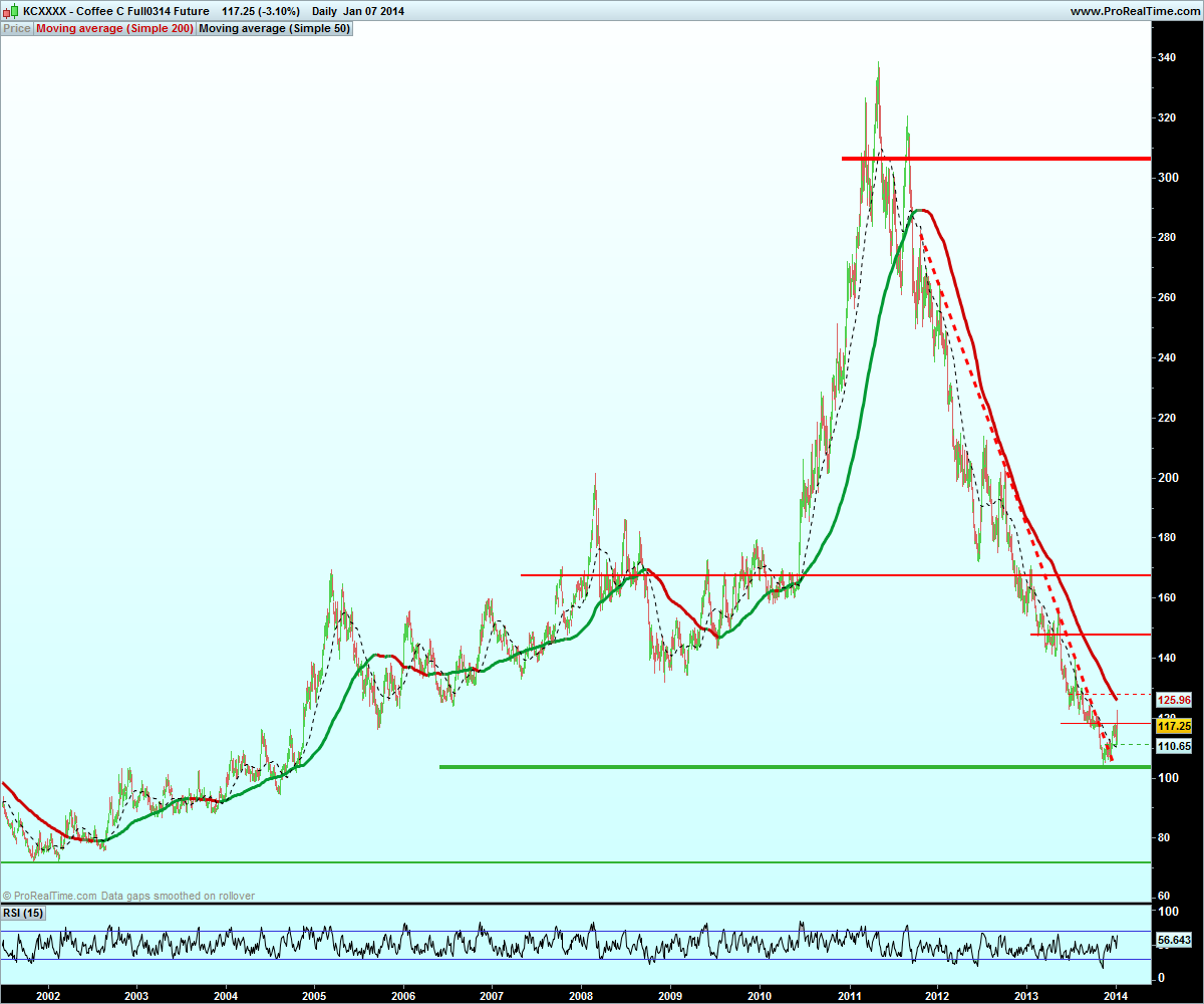 O café encontra-se num bear market profundo, desde o pico de 2011 perdeu dois terços do seu valor.
