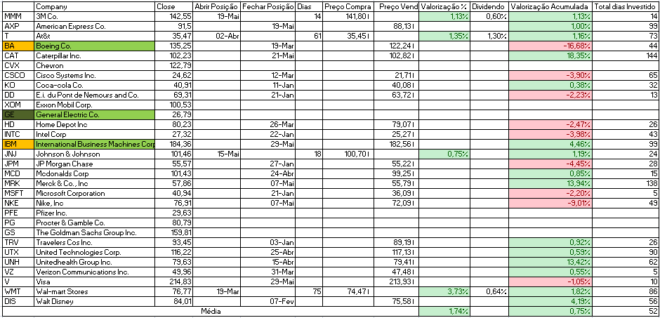 Para amanha as indicações são de venda: Boeing Co., Exxon Mobil Corp., Home Depot Inc, Nike, Inc e Walt Disney.