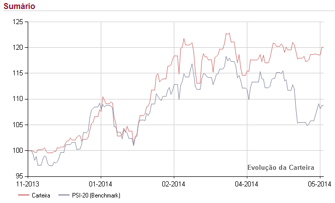 Se nos últimos 5 meses a rentabilidade ficou marcada por uma similitude com o PSI20 em termos de volatilidade, este mês de Maio destaca-se uma redução grande dessa volatilidade. O principal motivo dessa redução foram os bancos, que foram bastante castigados a meio do Mês de Maio, mas que o sistema já tinha dado indicação de saída em Abril. O que fez com que não fosse tão prejudicado.