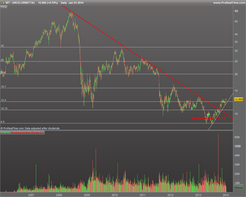 Depois de um bear market prolongado que se iniciou de forma abrupta na segunda metade de 2008, este papel perdeu praticamente 90% do seu valor, descendo dos ~59€ (máximo histórico) para os ~8,5 onde tocou por duas vezes ainda em 2013. No último meio ano, no entanto, deu-se uma aparente inversão de tendência, já registando a MT 50% sobre o seu valor nos mínimos de Julho passado.