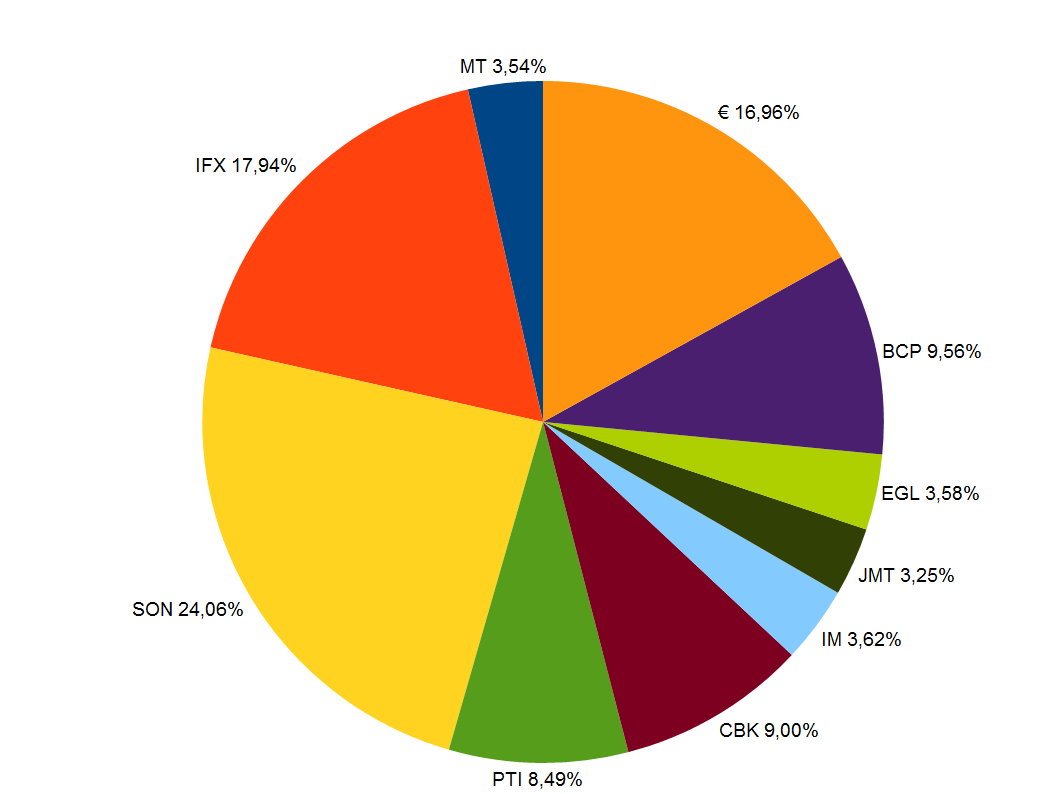 Fica a atualização ao dia de hoje do peso relativo das várias posições na carteira. Note-se que apenas 3 das 9 cotadas detidas representam mais de 50% da carteira, e 5 delas perto de 70%. Com o fecho da E. ON a liquidez já começa a representar uma percentagem demasiado significativa da carteira e o destino para essa liquidez será decidido durante o fim de semana, desde que o tempo disponível o permita.